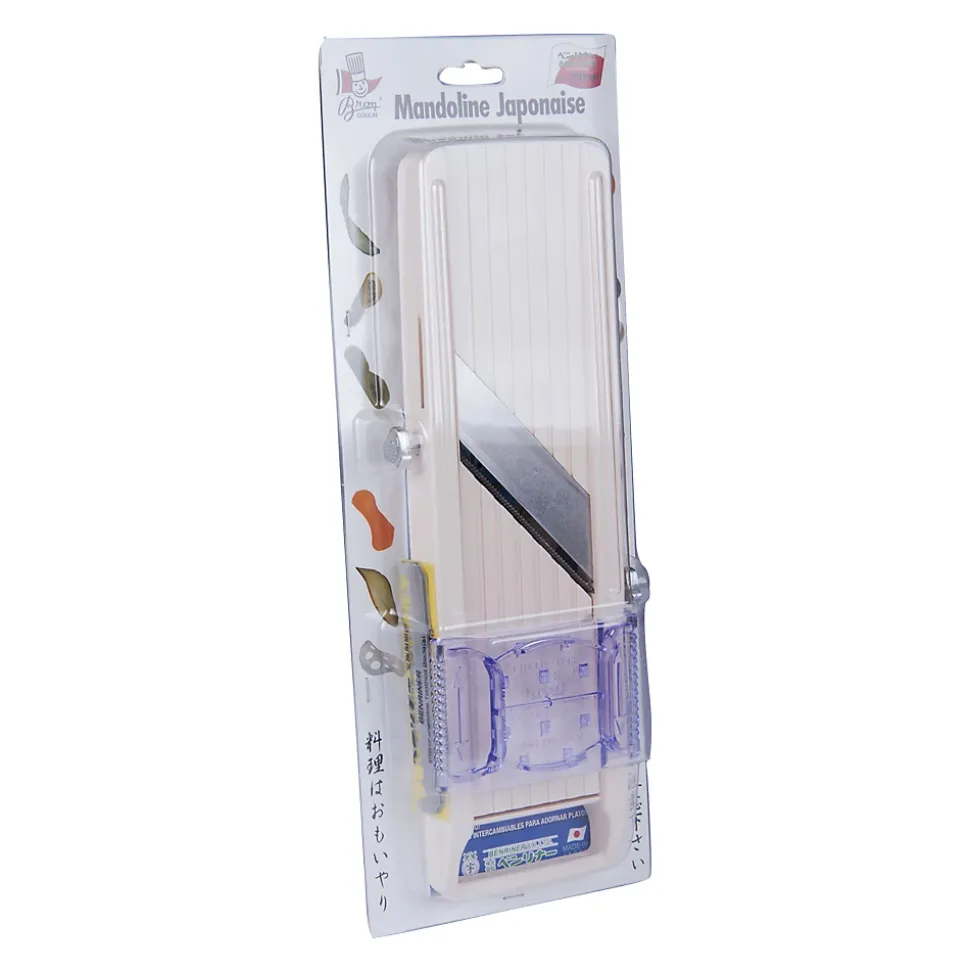 Pour vos chips de légumes et autres préparations, cette mandoline japonaise de haute qualité est idéale ! Pour une meilleure stabilité, elle dispose d’encoches pour la posez sur votre saladier et de patins antidérapants.Collection : DIVERS Matière : Plastique Couleur : Crème / Ivoire Longueur : 31.00 cm Largeur : 9.00 cm Hauteur : 4.00 cm