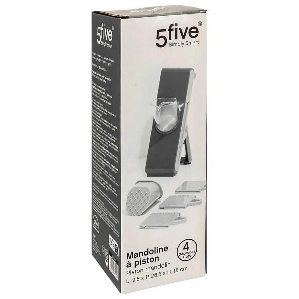 Mandoline multi découpe à poussoirContenu : 1 mandolineDimensions : L. 9.5 x P. 26.5 x H. 15 cmColoris : GrisMarque : 5 five simply smart