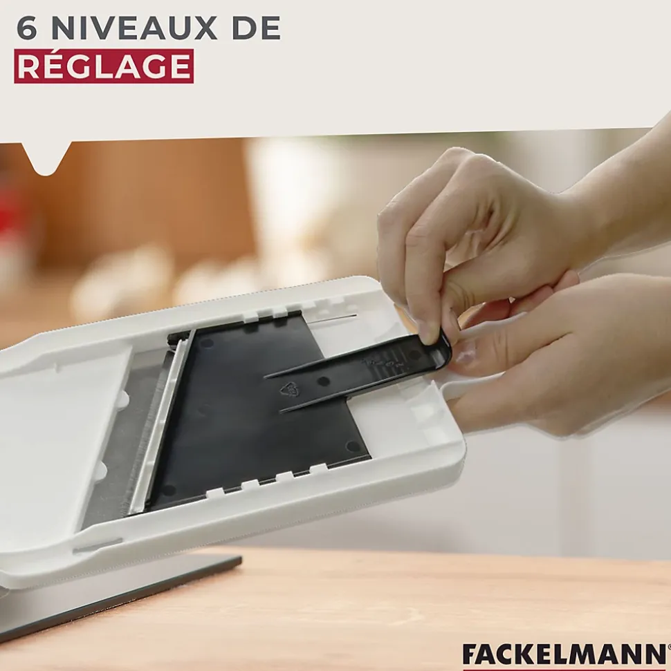 DESCRIPTION : Mandoline professionnelle réglable pour trancher des pommes de terre pour un gratin dauphinoisLE PETIT + : De plus, vous bénéficiez du protège main qui permet de ne pas se couper les doigts et les mains ! Vous pouvez également ajuster la taille de découpe de la mandoline de 1 à 6 mmCOMPOSITION : Acier inoxydable, plastiqueDIMENSIONS : 32 x 12 x 1,5 cmCONTENU : 1 mandoline manuelle + 1 protège mainCet ustensile de cuisine est une mandoline de cuisine permettant de trancher sans efforts vos fruits et légumes. Utilisez cette mandoline de cuisine professionnelle pour trancher des carottes, des concombres, des pommes de terre, des courgettes, des pommes, des poires etc pour confectionner de délicieux plats ou gâteaux.Cette mandoline est accompagnée d’un protège main, objet qui vous permet de trancher vos légumes jusqu’au bout sans risque de vous blesser.Fackelmann France est une entreprise spécialisée dans la distribution d’ustensiles de cuisine et de pâtisserie ainsi que de moules à gâteaux et de plaques de cuisson. L’entreprise tente d’apporter une certaine facilité dans la façon de cuisiner de chacun grâce à ses ustensiles malins.Les ustensiles de cuisine de Fackelmann France sont proposés à tous les profils de cuisiniers pour une utilisation simple et quotidienne. Les fouets, spatules, louches, éplucheurs, planches à découper et bien d’autres sont à votre portée afin de préparer de délicieuses recettes toujours plus originales.