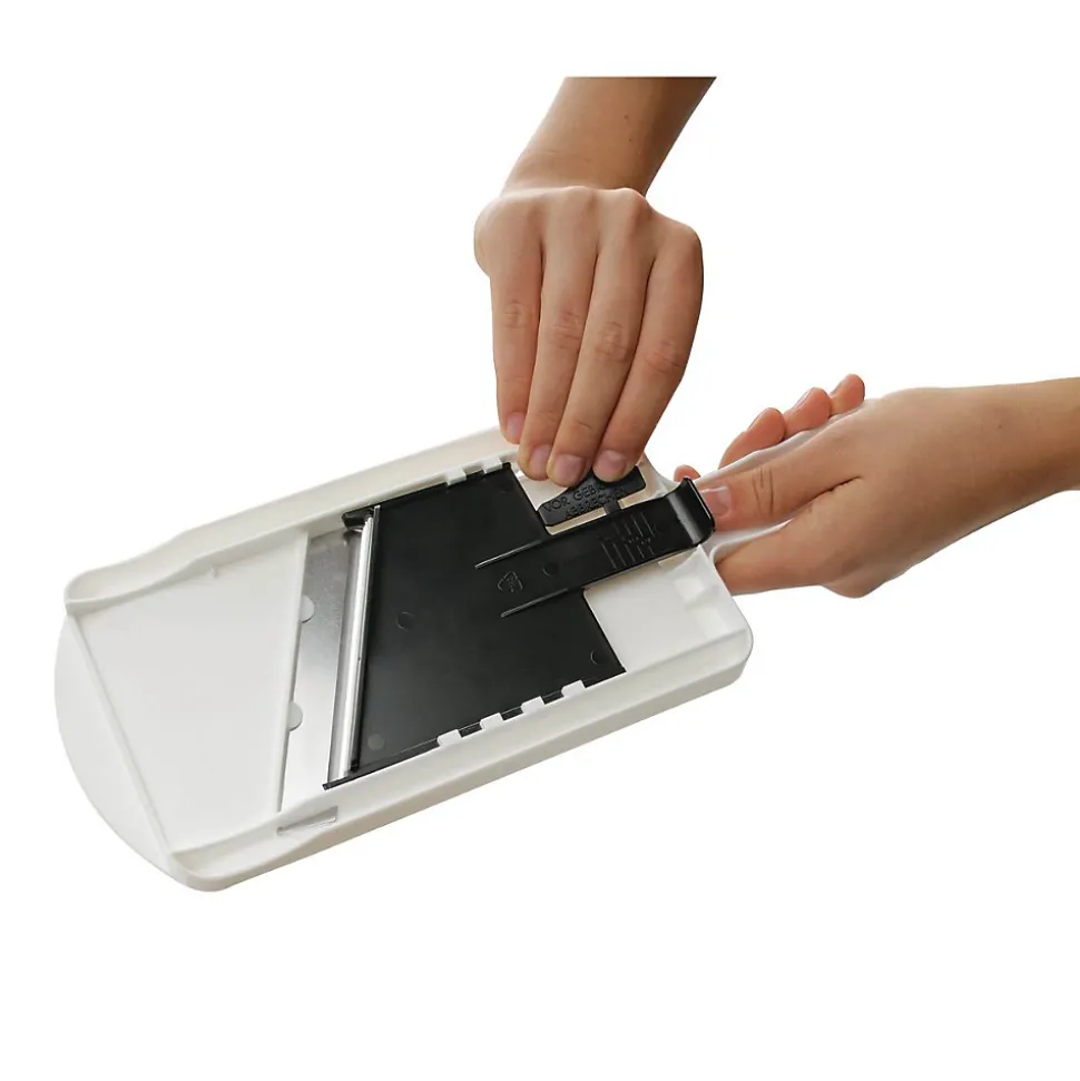 - LE PETIT + : De plus, vous bénéficiez du protège main qui permet de ne pas se couper les doigts et les mains ! Vous pouvez également ajuster la taille de découpe de la mandoline de 1 à 6 mm