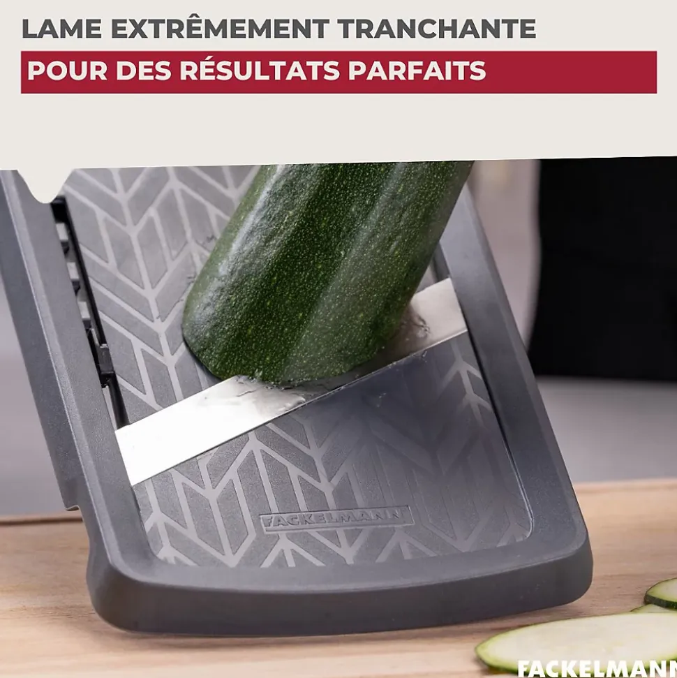 - DESCRIPTION: Mandoline réglable 4 épaisseurs de coupe Fackelmann, fabriquée en Allemagne et de haute qualité, avec lame hautement affûtée pour des coupes précises et régulières