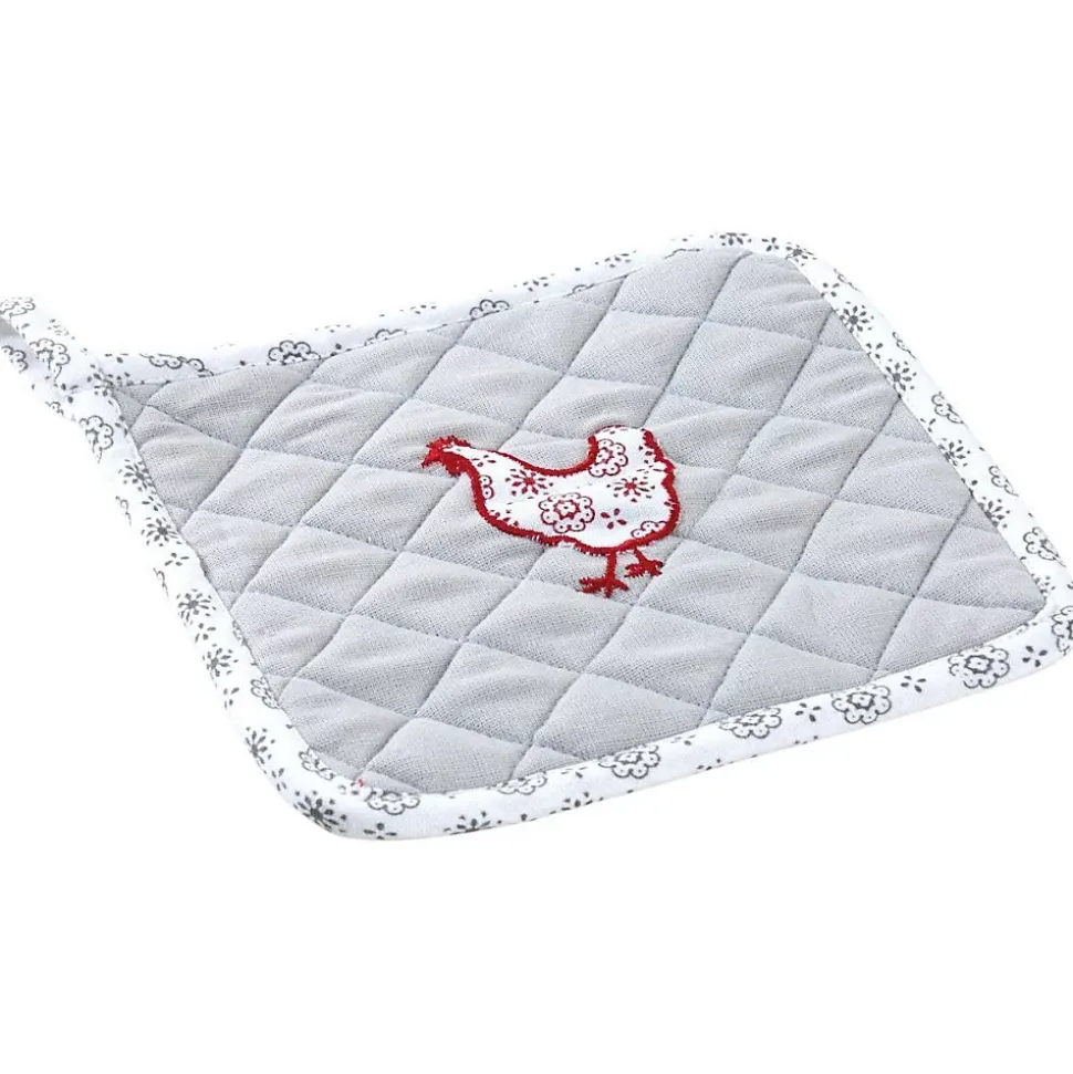 Aspect : Coloris = Gris Rouge • Matériau principal = Coton • Matériaux secondaires = Lin • Motif = Poule • Dimensions : Largeur (en cm) = 20,00 • Longueur (en cm) = 20,00 • Autres caractéristiques : Informations complémentaires = 100% coton • Poids (en kg) = 0,05 • Manique de cuisine en coton et lin poule