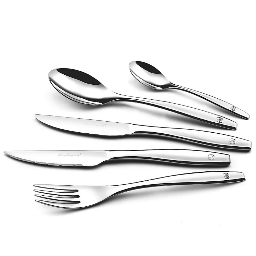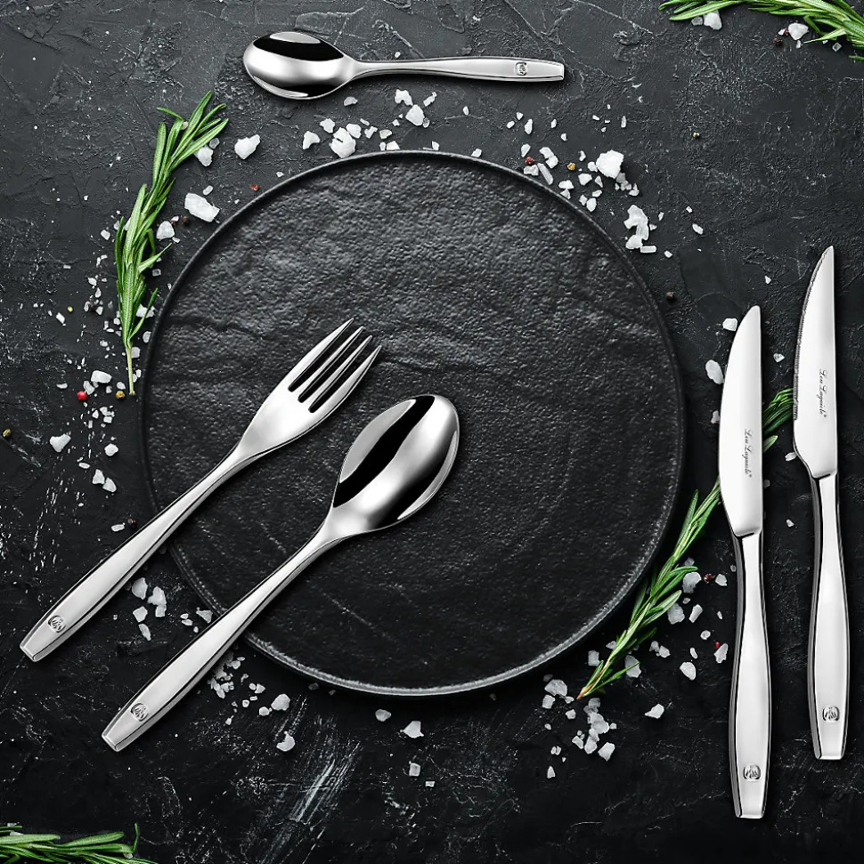 - 12 fourchettes de table, 12 cuillères de table, 12 cuillères café, 12 couteaux table, 12 couteaux steak, 1 cuillère et 1 fourchette de service