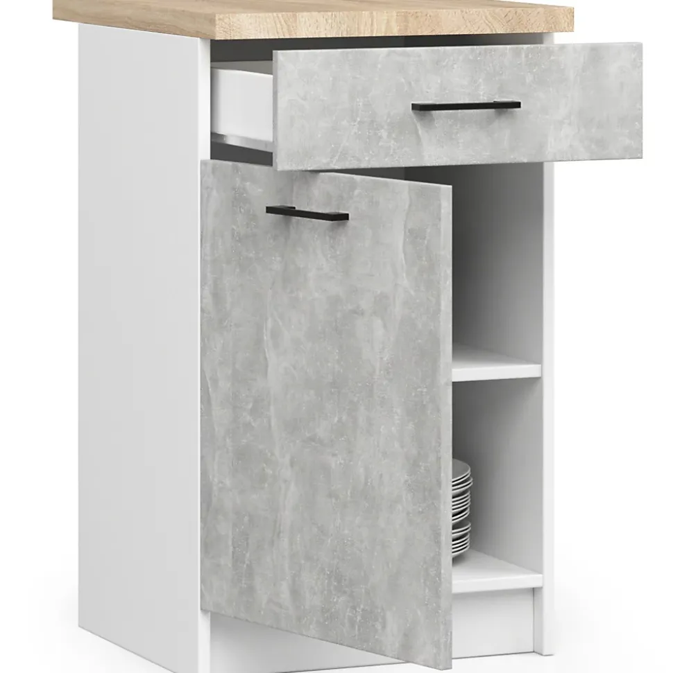 Meuble de cuisine bas AKORD S50 OLIWIA modulable Blanc 50 cm 1 porte 1 tiroir façade Béton 2 étagères 50x46x85 cmLe meuble de cuisine bas avec plan de travail OLIWIA est une proposition pour les personnes qui souhaitent aménager leur cuisine de manière intemporelle et universelle. Le meuble est destiné aux cuisines modulaires, il se caractérise avant tout par un design moderne, mais aussi par une excellente qualité. Le meuble permet de ranger les couverts, vaisselle, nourriture, produits de nettoyage et autres produits nécessaires dans chaque cuisine. Les armoires que nous proposons sont une combinaison de valeurs visuelles, de performances durables et de fonctionnalité. Le prix avantageux est également remarquable, ce qui rend les propositions de la collection OLIWIA très populaires.Dimensions: Largeur: 50 cmProfondeur: 46 cmSpécification:Matériau: panneau laminé de l’entreprise KronospanEacute;paisseur du panneau: 16 mmQualité du panneau: Certificat E1 *Bordure: ABS 0,5 mmColour: BlancNombre d’étagères: 2Nombre de tiroirs: 1largeur de tiroir: 41 cmNombre de portes: 1* Certificat E1, classe d’hygiène E1