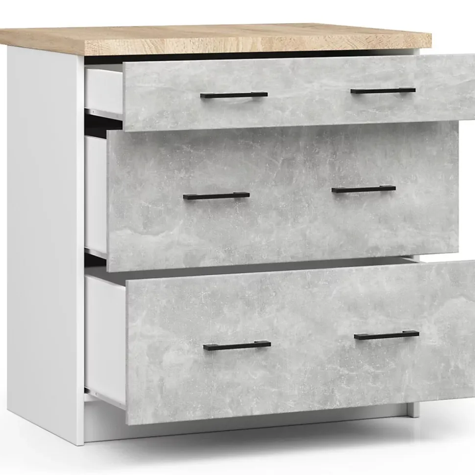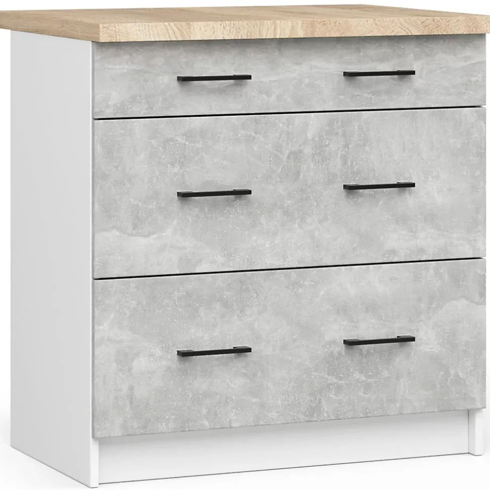 Meuble de cuisine bas AKORD S80 OLIWIA modulable Blanc 80 cm 3 tiroirs façade Béton 80x46x85 cmLe meuble de cuisine bas avec plan de travail OLIWIA est une proposition pour les personnes qui souhaitent aménager leur cuisine de manière intemporelle et universelle. Le meuble est destiné aux cuisines modulaires, il se caractérise avant tout par un design moderne, mais aussi par une excellente qualité. Le meuble permet de ranger les couverts, vaisselle, nourriture, produits de nettoyage et autres produits nécessaires dans chaque cuisine. Les armoires que nous proposons sont une combinaison de valeurs visuelles, de performances durables et de fonctionnalité. Les poignées lumineuses permettent une ouverture et une fermeture faciles de l’armoire. Le prix avantageux est également remarquable, ce qui rend les propositions de la collection OLIWIA très populaires. Dimensions: Largeur: 80 cmProfondeur: 46 cmSpécification:Matériau: panneau laminé de l’entreprise KronospanEacute;paisseur du panneau: 16 mmQualité du panneau: Certificat E1 *Bordure: ABS 0,5 mmColour: BlancNombre de tiroirs: 3largeur de tiroir: 71 cm* Certificat E1, classe d’hygiène E1
