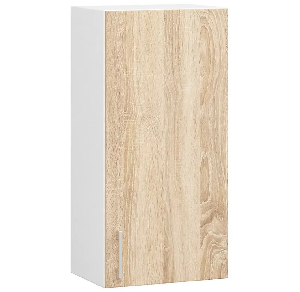 Meuble de cuisine haut AKORD W40 LIMA modulable Blanc 40 cm 1 porte façade Chêne Sonoma 2 étagères 40×30,5×72 cmLe meuble de cuisine accrochable au mur LIMA est une proposition pour les personnes qui souhaitent aménager leur cuisine de manière intemporelle et universelle. La proposition provient d’une collection dans laquelle les éléments d’équipement combinent deux teintes à la mode. Le meuble permet de stocker du café, du thé, des verres et d’autres articles de table. Les armoires que nous proposons sont une combinaison de valeurs visuelles, de performances durables et de fonctionnalité. Les poignées lumineuses permettent une ouverture et une fermeture faciles de l’armoire. Le prix avantageux est également remarquable, ce qui rend les propositions de la collection LIMA très populaires. Dimensions: Largeur: 40 cmProfondeur: 30,5 cmSpécification:Matériau: panneau laminé de l’entreprise KronospanEacute;paisseur du panneau: 16 mmQualité du panneau: Certificat E1 *Bordure: ABS 0,5 mmColour:Caisson : BlancFaçades : Chêne SonomaNombre d’étagères: 2Nombre de portes: 1* Certificat E1, classe d’hygiène E1
