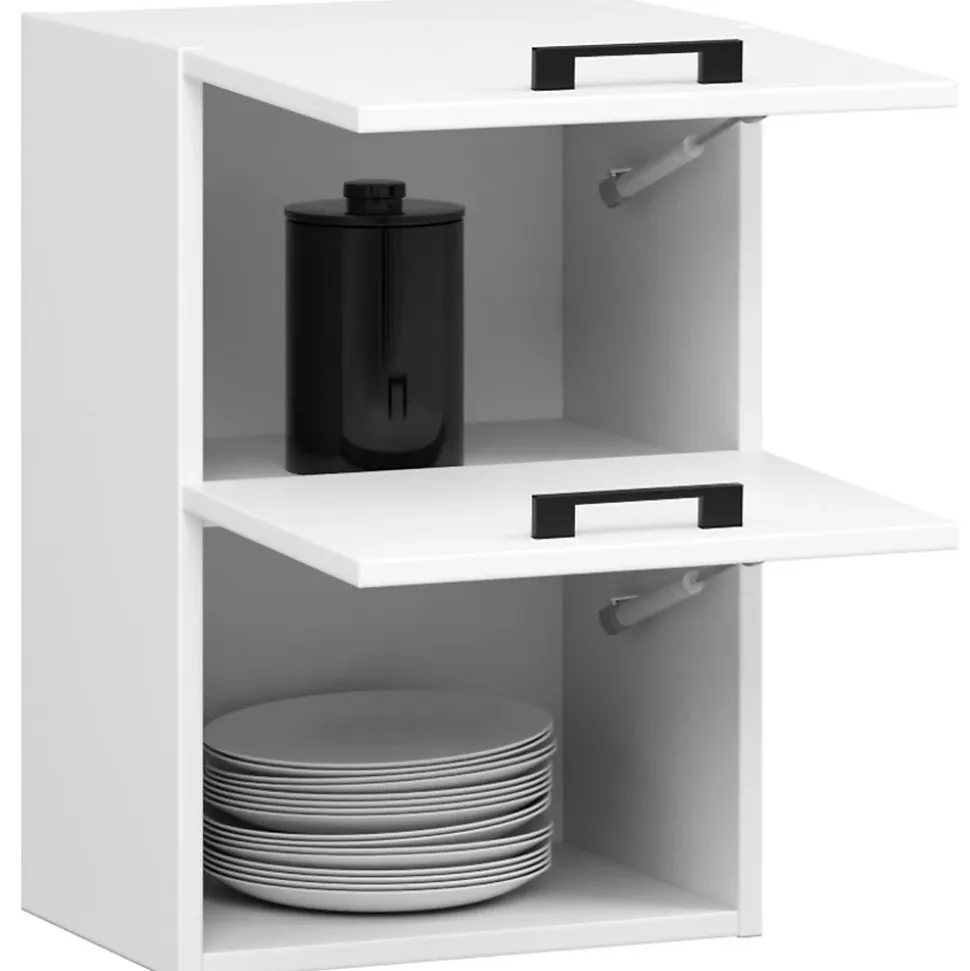 Meuble de cuisine haut AKORD W40 OLIWIA G2 modulable Blanc 40 cm 2 portes façade Blanche 2 étagères 40x30x58 cmLe meuble de cuisine accrochable au mur OLIWIA est une proposition de la cuisine moderne blanche avec poignées noires. Il offre la simplicité et minimalisme dans le style scandinave. La cuisine suit les dernières tendances en matière de couleurs et offre beaucoup de liberté grâce aux possibilités de construction modulables. Le meuble permet de stocker du café, du thé, des verres et d’autres articles de table. Les armoires de cuisine de la série Oliwia sont une solution bon marché pour aménager l’espace dans la cuisine. Le design classique et le prix bas s’adaptent parfaitement au design intérieur de n’importe quel appartement. Le système se compose de nombreuses armoires pour construire n’importe quelle cuisine. Dimensions: Largeur: 40 cmProfondeur: 30 cmSpécification:Matériau: panneau laminé de l’entreprise KronospanEacute;paisseur du panneau: 16 mmQualité du panneau: Certificat E1 *Bordure: ABS 0,5 mmColour:Caisson : BlancFaçades : BlancNombre d’étagères: 2Nombre de portes: 2* Certificat E1, classe d’hygiène E1