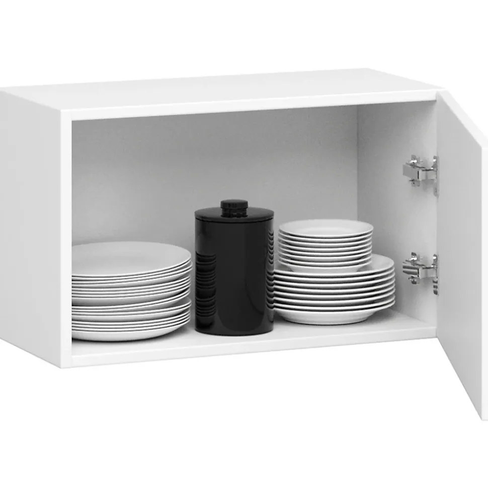 Meuble de cuisine haut AKORD W60 hotte OLIWIA modulable Blanc 60 cm 1 porte couleur Blanc 1 étagère 60x30x29 cmLe meuble de cuisine hotte accrochable au mur OLIWIA est une proposition de la cuisine moderne blanche avec poignées noires. Il offre la simplicité et minimalisme dans le style scandinave. La cuisine suit les dernières tendances en matière de couleurs et offre beaucoup de liberté grâce aux possibilités de construction modulables. Le meuble permet de stocker du café, du thé, des verres et d’autres articles de table. Les armoires de cuisine de la série Oliwia sont une solution bon marché pour aménager l’espace dans la cuisine. Le design classique et le prix bas s’adaptent parfaitement au design intérieur de n’importe quel appartement. Le système se compose de nombreuses armoires pour construire n’importe quelle cuisine. Dimensions: Largeur: 60 cmProfondeur: 30 cmSpécification:Matériau: panneau laminé de l’entreprise KronospanEacute;paisseur du panneau: 16 mmQualité du panneau: Certificat E1 *Bordure: ABS 0,5 mmColour:Caisson : BlancFaçades : BlancNombre d’étagères: 1Nombre de portes: 1* Certificat E1, classe d’hygiène E1