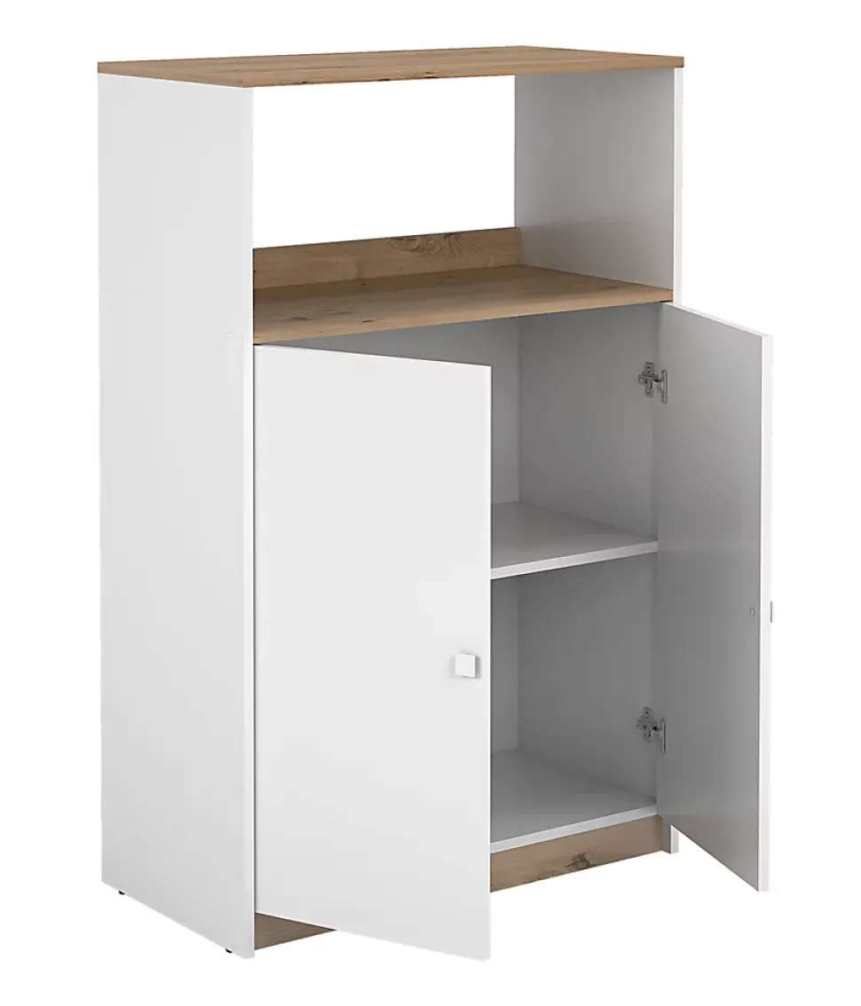 Meuble de rangement de cuisine coloris chêne Albar, blanc. Equipée de 2 portes de rangement et 1 niche. Fabriquée avec des panneaux de particules haute densité avec décor et finition mélamine de qualité. Produit de fabrication Espagnol certifié PEFC . Livré en kit.Dimensions : Hauteur 124 x Longueur 80 x profondeur 40 cmMatière : bois mélamine Coloris : chêne Albar, blancPoids : 14 kg