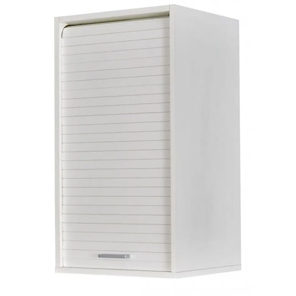 Meuble haut blanc 40 x 72 x 35 cm équipé d’un rideau coulissant, 2 étagères réglables, pose au mur ou sur plan de travail (fixations fournies). Panneaux mélaminés E1 16 mm, arrière MDF 5 mm. Fabrication française, éco-conçu, garanti 2 ans.