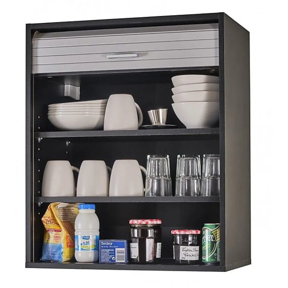 Meuble haut de cuisine 60 x 72 x 35 cm, coloris noir avec rideau (Blanc, Chêne ou Alu). Équipé d’un rideau coulissant vertical, de 2 tablettes réglables et livrable posé ou à suspendre (fixations fournies). Éco-conçu, fabriqué en France, certifié PEFC. Garantie fabricant 2 ans.