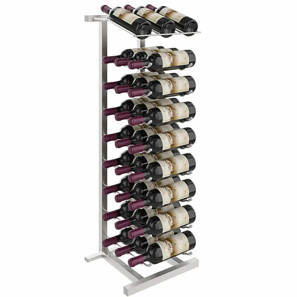 DIMENSIONS ET CAPACITÉ DE BOUTEILLES : 97,8 x33 x68cm. Peut contenir 27 bouteilles de vin de 750 ml. Fabriqué d’aluminium brossé.