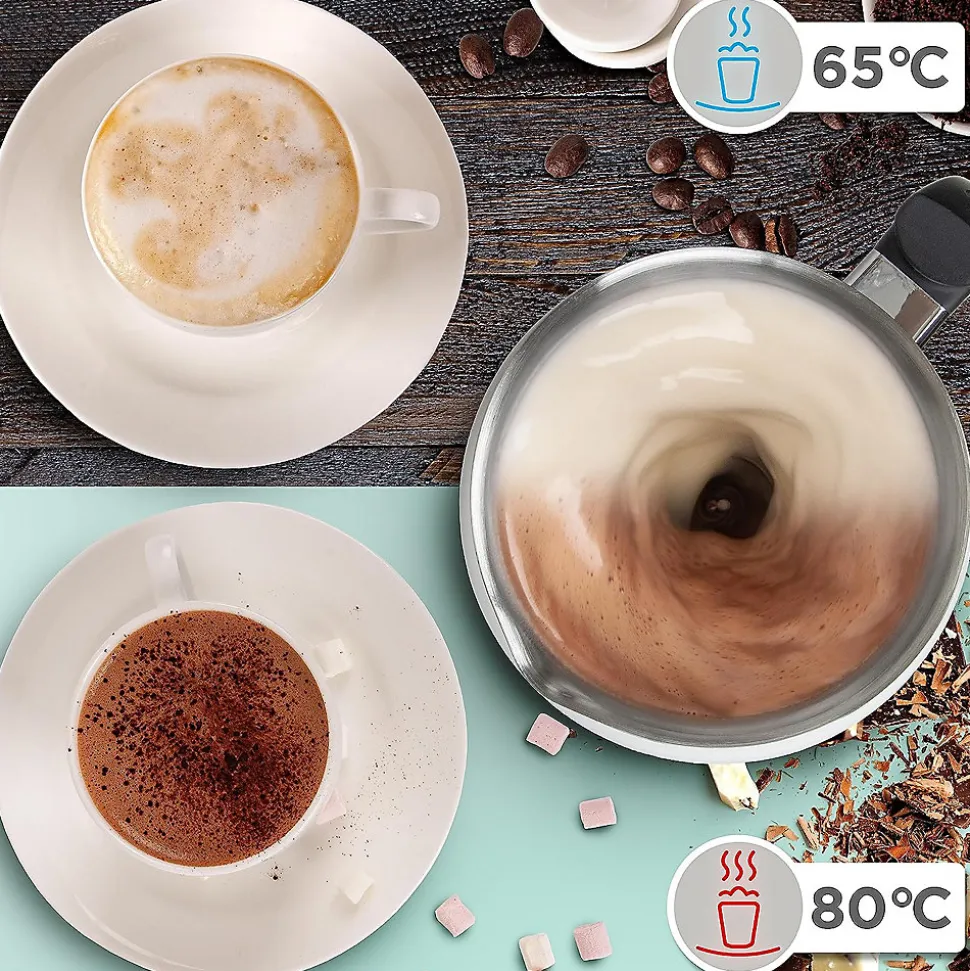 Découvrez le Mousseur à lait MF500 de Duronic, un appareil hautement performant pour préparer des boissons à base de mousse de lait, chaudes ou froides. Doté d’une carafe rotative à 360 degrés, cet appareil vous offre une grande liberté de mouvement tout en assurant une mousse parfaite. Le MF500 vous permet de préparer des mousses chaudes ou froides en quelques minutes. Vous pouvez même réchauffer le lait sans mousser.Avec sa capacité maximale de moussage de 260 ml, vous pouvez créer de somptueuses mousses pour vos cafés et autres boissons. Conçu avec un bol en acier inoxydable, cet appareil est facile à nettoyer et résiste au lave-vaisselle. De plus, il est équipé d’une protection de sécurité qui éteint automatiquement l’appareil si le bol est sec, assurant ainsi une utilisation sans risque. Avec une puissance maximale de 550W, cet appareil vous permet de chauffer le lait jusqu’à 80 degrés pour obtenir une boisson bien chaude. Vous avez également le choix entre trois réglages de température : froid, 65°C ou 80°C. L’appareil est livré avec deux fouets magnétiques, un pour réchauffer et l’autre pour faire mousser le lait.Les dimensions compactes du MF500 de 17 cm par 24 cm en font un appareil pratique et peu encombrant dans votre cuisine. Vous pouvez les ranger facilement sous la base de l’appareil. Sa poignée ergonomique facilite son utilisation et son couvercle inclus garde votre préparation bien protégée.Si vous avez besoin de plus petites capacités, Duronic propose également le MF300 avec une capacité de 300 ml pour mousser et 400 ml pour chauffer, ainsi que le MF130 avec une capacité de 130 ml pour mousser et 240 ml pour chauffer. Disponible en noir élégant ou en blanc épuré, le mousseur à lait MF500 est un incontournable pour tous les amateurs de café qui souhaitent préparer des boissons dignes d’un barista. N’hésitez plus et offrez-vous cet appareil pour des moments café mémorables !