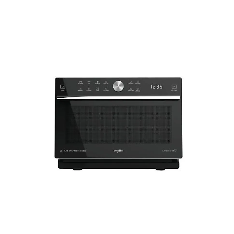 Whirlpool MWSC933SB Supreme Chef 33L – micro‑ondes combiné (900 W) avec gril 1200 W, plateau tournant 36 cm, technologie 6ème SENS, Dual Crisp et Dual Steam pour des plats croustillants, programmes automatiques (Menu Chef), Jet Defrost et Bread Defrost, fonctions AutoClean, écran LED, verrouillage enfant. Finition inox noir/argent, installation posable indépendante.