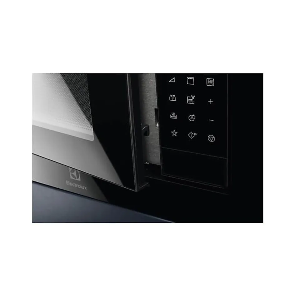 Four micro-ondes encastrable Electrolux LMS4253TMK 25 L, 900 W micro-ondes et grill 1000 W, cavité inox, plateau tournant 27 cm, commandes tactiles avec affichage LED, 8 niveaux de puissance, programmes automatiques selon le poids, fonction décongélation, verrouillage enfant, éclairage intérieur et horloge électronique.