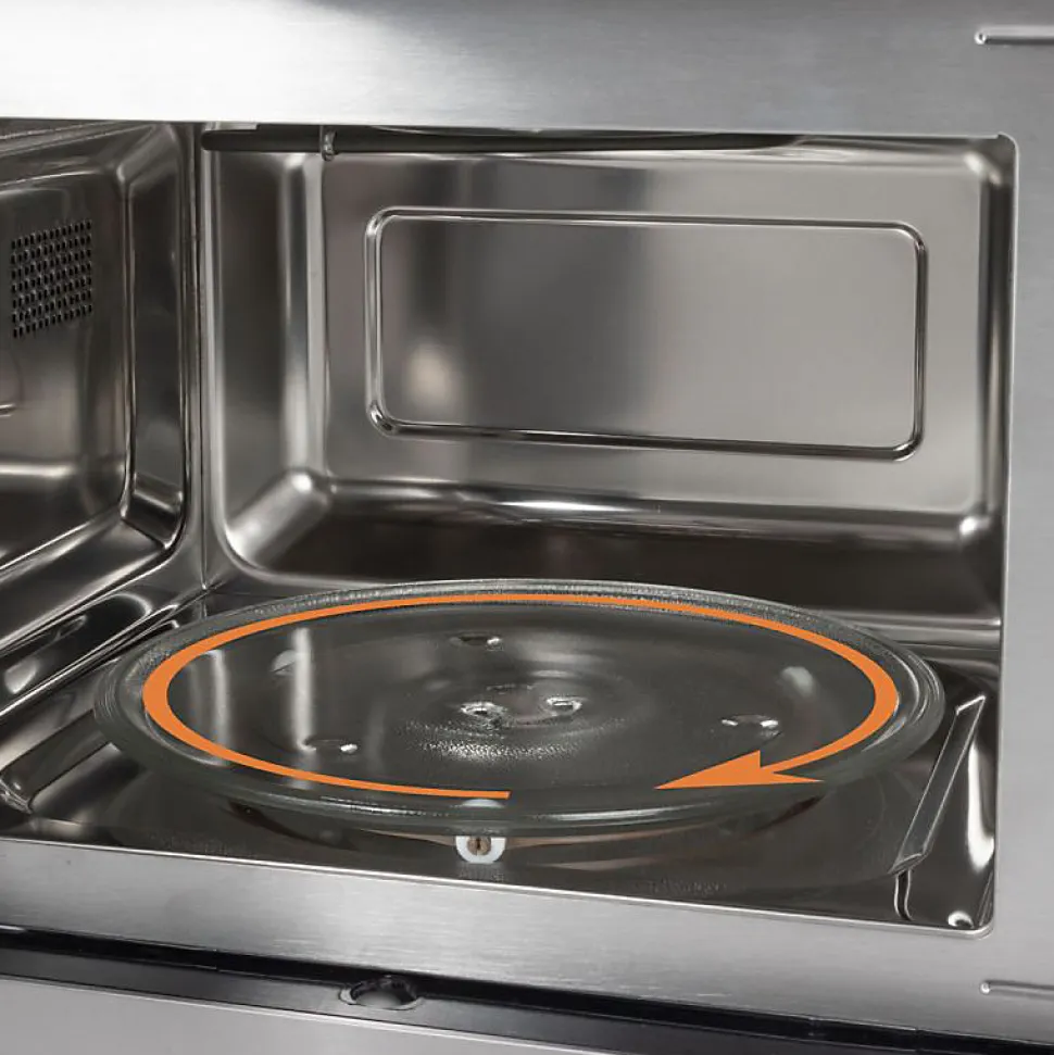Micro-ondes encastrable sans cadre■ Façade en acier inoxydable, intérieur en acier inoxydable■ Affichage LCD / Horloge numérique■ Micro-ondes de 900 watts■ Gril 1300 watts■ Convection 2300 watts■ 5 niveaux de puissance de micro-ondes■ 2 niveaux en fonctionnement combiné (gril/micro-ondes)■ 2 niveaux en fonctionnement combiné (micro-ondes/convection)■ 1 niveau de gril■ 5 réglages de température pour la convection (100°C-200°C)■ 8 programmes automatiques / Programme de décongélation■ Fonction de démarrage rapide■ Capacité du four de 25 litres■ Fonction minuterie avec jusqu’à 24 heures de retard■ Plaque tournante : Ø env. 27,0 cm, grille de gril : Ø env. 22,2 cm■ Minuterie de 60 minutes avec signal de fin■ Sécurité enfants■ Eclairage du four■ 230 V, 50 Hz, 2300 W■ Appareil (WxHxD) : 595 x 390 x 351 mm■ Poids : environ 17 kg