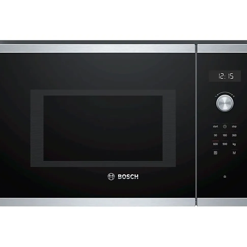 Micro-ondes encastrable Bosch Série 6 BFL554MS0 25 L, 900 W : façade verre noir avec bord inox, cavité inox, plateau tournant verre Ø31,5 cm, 7 programmes AutoPilot, affichage LED, commandes tactiles et rotatives, minuterie jusqu’à 99 min, charnières à gauche, conçu pour niche 38 cm.