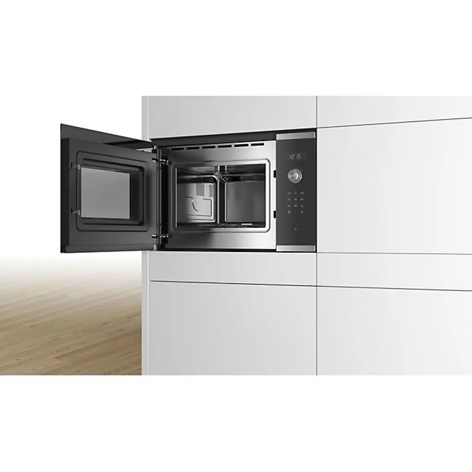 Alliez design moderne et performance avec le micro-ondes encastrable Bosch Série 6 BFL554MS0. Grâce à ses 7 programmes automatiques AutoPilot, il vous garantit des résultats parfaits pour réchauffer, décongeler ou cuire vos plats en toute simplicité. Son affichage LED, ses boutons escamotables et sa commande tactile offrent une prise en main intuitive. Compact mais puissant (900 W), il s’intègre parfaitement dans une niche de 38 cm et dispose d’un plateau tournant de 31,5 cm pour une cuisson homogène. Son intérieur en inox, son ouverture électronique et son éclairage LED en font un appareil aussi pratique qu’élégant. Idéal pour les cuisines modernes à la recherche de gain de place sans compromis sur la qualité.