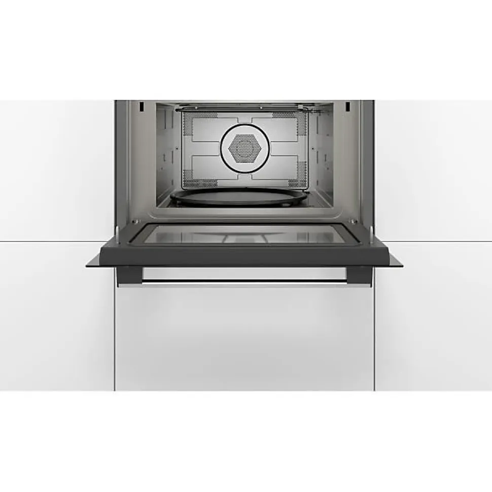 BOSCH – Four micro-ondes combiné encastrable inox 44 l – Bouton à prise centrale, Boutons escamotables, commandes par touchControl – Cavité Acier inox – 15 programmes automatiques – Gril 1.75 kW – Puissances du gril et du micro-ondes 90 W, 180 W, 360 W, 600 W combinables – Horloge électronique – Eclairage LED – Plateau tournant émaillé 36 cm – Sécurité enfants – Coupure automatique du four – Interrupteur au contact