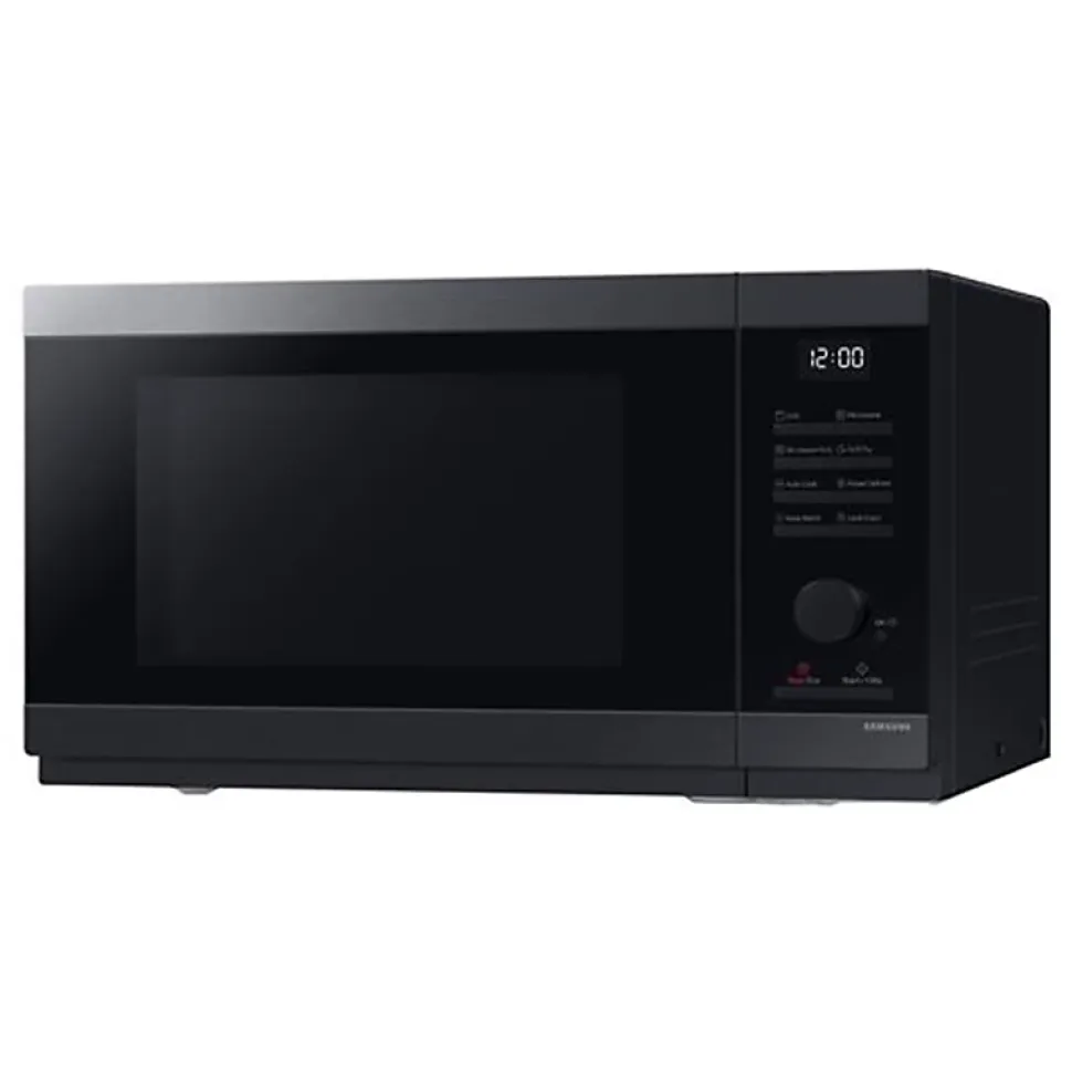 Micro-ondes gril 32l 1400w inox noir Samsung – Croquant et croustillantProfitez d’un plat croquant et croustillant comme dans un four traditionnel. La fonction Gril Fry cuit, gratine et grille les aliments grâce au plat croustilleur. Idéal pour cuire à la perfection des plats congelés tels qu’un filet de poisson ou de poulet frais. La cuisson se fait sans huile ce qui rend la nourriture plus saine.Redonnez sa fraîcheur à votre pain surgelé !Profitez du goût du pain frais à tout moment. La fonctionnalité «Bread Defrost» (décongélation du pain) calcule automatiquement la durée et température optimales pour décongeler pains & viennoiseries surgelés en fonction de leur poids. Le plafonnier assure une décongélation et coloration réussies.Porte minimaliste avec poignée dissimuléeDonnez à votre cuisine une ambiance ultra-moderne grâce au design élégant et minimaliste du micro-ondes. La poignée dissimulée, située au-dessus et en-dessous de la porte, permet une ouverture facile même si le micro-ondes est installé dans une niche. Sa porte plane minimaliste avec ses finitions inox lui donnent un aspect épuré et élégant.Facile à nettoyer : Plafonnier métalliqueLa résistance des micro-ondes est en métal, qui est à la fois résistante aux chocs éventuels et facile à nettoyer puisqu?aucune grille de protection n’est nécessaire.Décongélation rapide : Power DefrostDécongelez les aliments plus rapidement. Power Defrost vous permet de choisir parmi 4 catégories courantes de nourriture : viande, volaille, poisson et pain. Sélectionnez le type* ainsi que le poids de l’aliment et le micro-ondes calcule le temps de décongélation optimal. Cela réduit le temps de préparation** tout en préservant les nutriments.Cavité céramique émail : Intérieur facile à nettoyerLe nettoyage de votre micro-ondes devient plus facile. La cavité céramique émail peut être nettoyée sans frotter, ne se décolore pas* et est reconnue pour son action