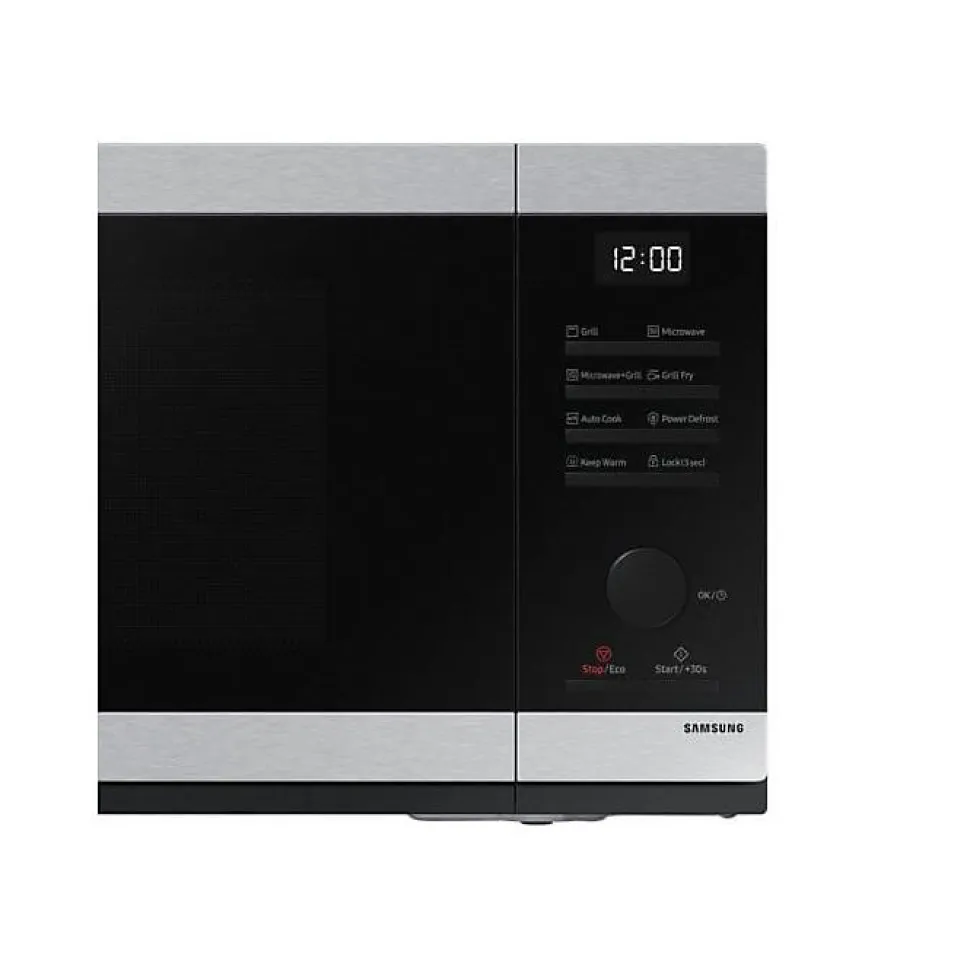 Micro-ondes grill 32l 900w inox Samsung – Micro-ondes grill MG32DG4524CT de Samsung.Chauffage par résistance métallique :Le plafonnier est métallique : plus résistant que le quartz, plus durable mais aussi plus facile à nettoyer.Design contemporain avec poignée cachée :Design modernisé avec finition inox noire,équipé d’une porte minimaliste. Sonaspect simple et épuré est accentué par une poignée encastrée qui permet une ouverture par le haut ou le bas.Décongélation Power Defrost :Cette technologie réduit le temps de décongélation nécessaire aux aliments, tout en préservant l’aspect et les qualités nutritionnelles. Sélectionnez simplement parmi 4 catégories courantes de nourriture : viande, volaille, poisson ou pâte/gâteau.Cavité céramique émail :La cavité céramique émail offre non seulement de meilleures performances de cuisson mais aussi une excellente résistance à l’usure et à l’abrasion.Comparés aux revêtements en acier inoxydable ou en époxy, les revêtements en céramique émail sont antibactériens, faciles à nettoyer et plus résistants.Utilisation simplifiée :Le panneau de commande a été simplifié avec seulement 8 boutons dédiés aux fonctions essentielles les plus fréquemment utilisées. Un bouton permetégalement une utilisation plus intuitive et un contrôle plus précis. Les paramètres sont facilement ajustables. – Type de produit : Micro-ondes gril.Fonction du modèle : Gril.Installation : A poser.Capacité : 32 l.Contrôle : Electronique + bouton.Couleur LED : Blanche.Nature de la cavité : Céramique émail.Puissance restituée en watts (IEC – 705) : 900W.Niveau de puissance micro-ondes : 6.Puissance absorbée en watts : 1500w.Rappel sonore de fin de cuisson : Oui.Horloge 12/24 heures : Oui.Type d’ouverture : Latérale avec bouton.Minuteur de cuisson : 99 min.Programmes automatiques : 8.Type de commande :