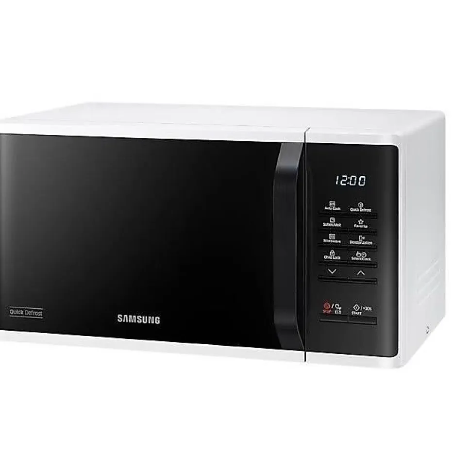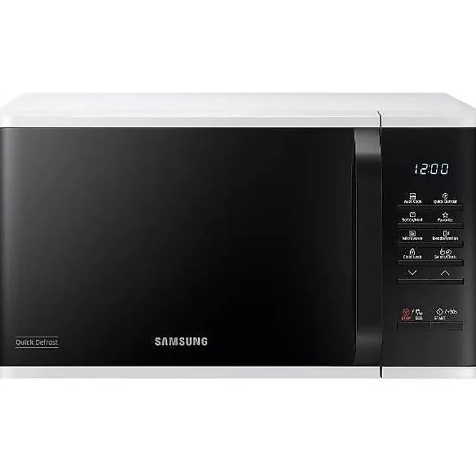 Micro-ondes solo Samsung 23 L, 800 W avec écran LED, 6 niveaux de puissance, fonction Quick Defrost, cavité en émail céramique facile à nettoyer, plateau tournant 330 mm et grille incluse.