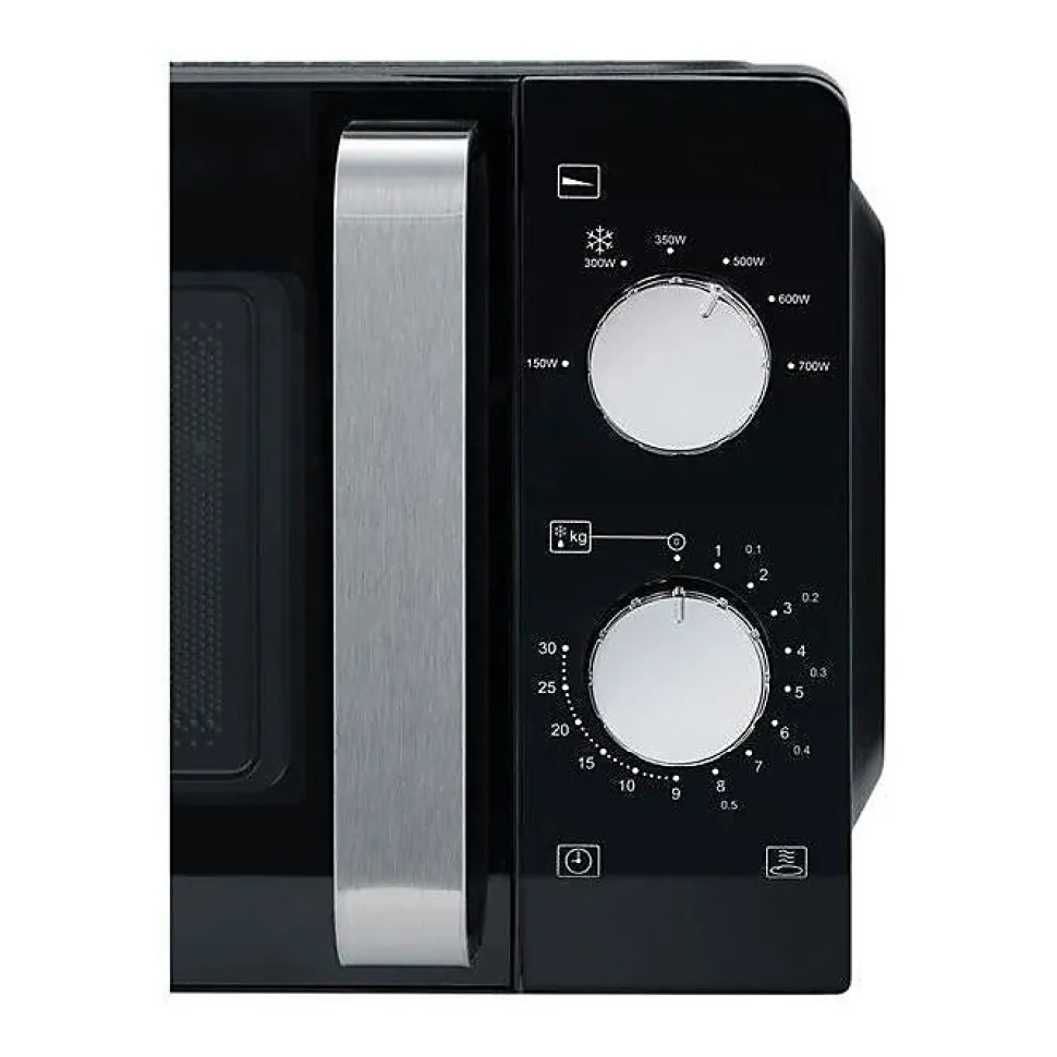 Micro-ondes compact 17 l, puissance 700 W et 6 niveaux de réglage pour chauffer, décongeler et réchauffer en toute simplicité. Minuterie mécanique 30 minutes avec signal de fin, plateau tournant 24,5 cm pour une cuisson homogène, intérieur peint résistant à la chaleur pour un nettoyage facile, poignée et bouton rotatif chromés pour une prise en main agréable.