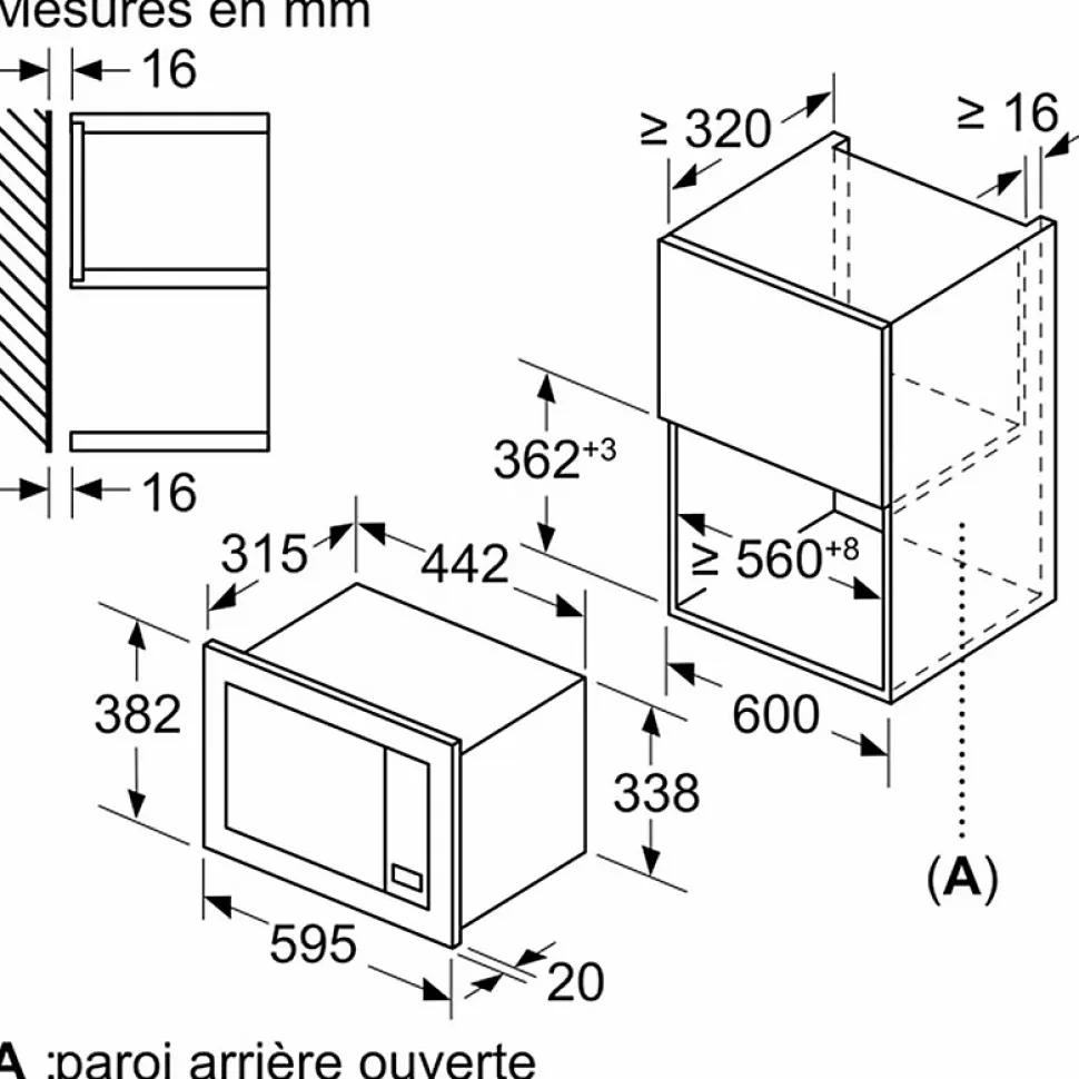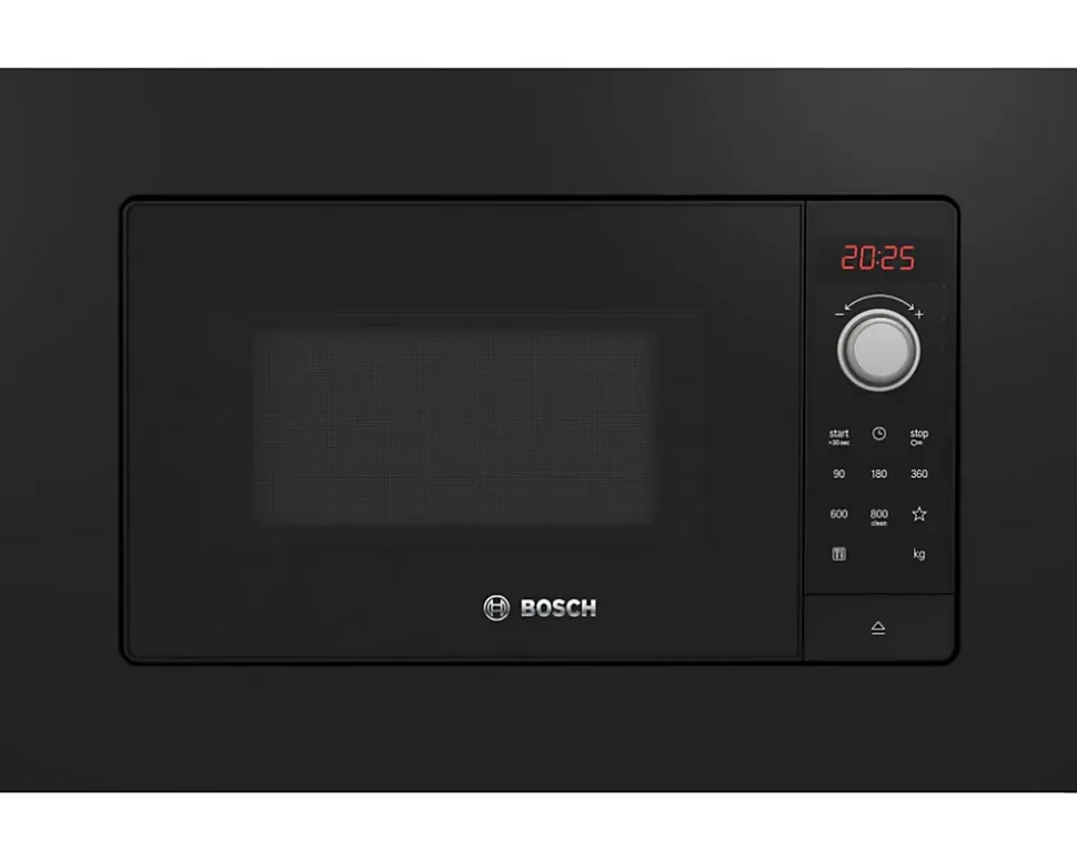 Micro-ondes solo 20l 800w encastrable noir Bosch – Micro-ondes solo intégrable Série 2 Bosch BFL623MB3 permettant de décongeler, réchauffer et cuisiner. Fonction micro-ondes : pour décongeler, réchauffer et préparer rapidement vos plats. AutoPilot7 : 7 programmes automatiques pour des résultats de cuisson parfaits. Bouton Favoris : Enregistrer vos réglages favoris. QuickStart : Réchauffez vos plats en une touche. Assistant nettoyage : moins d’effort grâce au programme nettoyage. – Type de produit : Micro-ondes encastrable monofonction.Encastrable : Oui.Type : Classique.Fonctions : Classique.Volume (L) : 20.Puissance micro-ondes (W) : 800.Gril : Non.Chaleur tournante : Non.Niveaux de puissance : 5.Type de commande(s) : Electroniques.Couleur : Noir.Finition / Nuance : Laqué.Système de nettoyage : Hydrolyse.Cuisson vapeur : Non.Cuisson croustillante : Non.Décongélation : Oui.Autre(s) fonction(s) : 4 décongélation et 3 en fonction micro ondes.Programmateur électronique : Oui.Nbre de programmes auto. : 7.Système d’ouverture de la porte : Latérale.Charnières : Charnières à gauche.Plateau tournant : Oui.Diam. plateau tournant (cm) : 27.Type d’éclairage intérieur : LED.Autre(s) : Bouton Favori, Quick Start (Bouton pour 30 secondes additionnelles).Ecran : Oui.Type d’affichage : Display LED.Sécurité enfants : Oui.Autre(s) sécurité(s) : Coupure automatique du four, Interrupteur au contact de la porte.Dimensions (H x L x P en cm) : 38.2 x 59.5 x 33.5.Encastrement H x L x P (cm) : 56-56.8 x 36.2-36.5 x 32.Poids (kg) : 13.8.