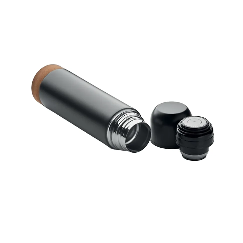 Matière : liège, acier inoxydable recyclé. Hauteur : 25cm. Longueur : 6,5cm. Largeur : 6.5cm. Double paroi, étanche, couvercle vissé, isolé sous vide. Design : Plain. Capacité : 500ml. Emballage : Boîte. Développement durable : Amfori, BSCI.