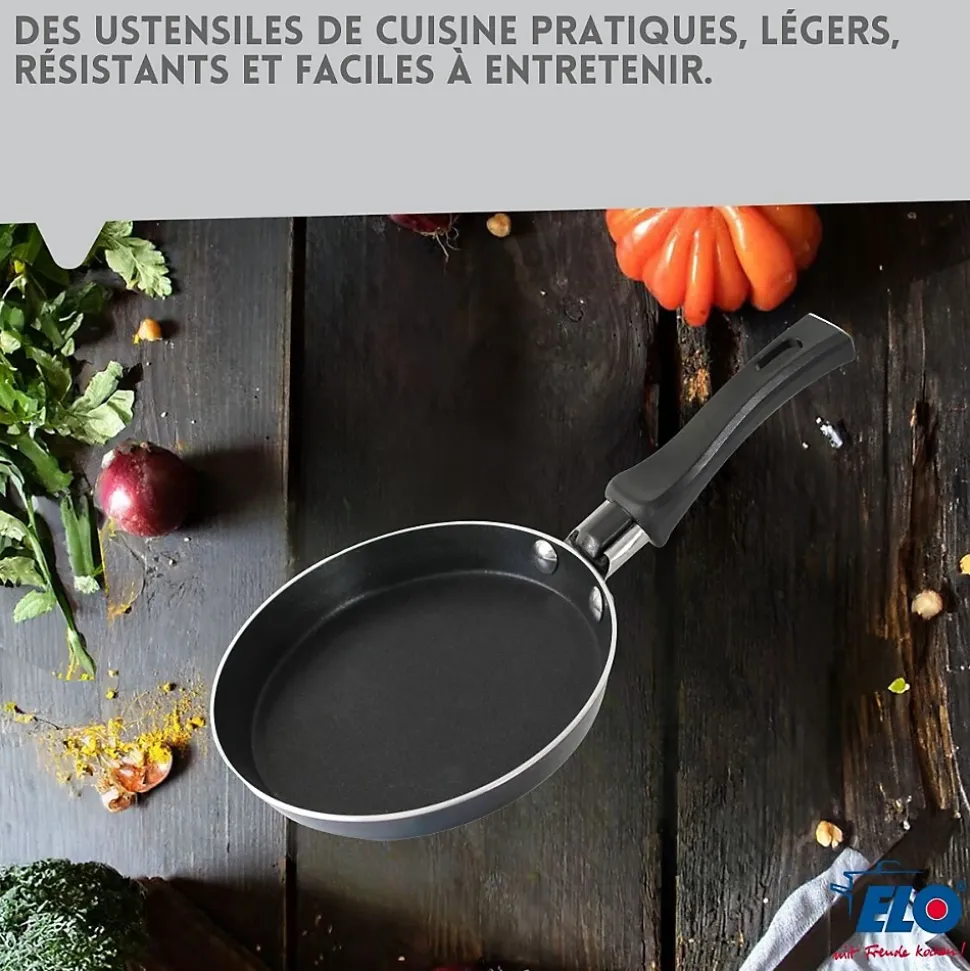 - DESCRIPTION : La mini crêpière Elo de 14 cm est idéale pour préparer de délicieux petits déjeuners; Fabriquée en aluminium, elle est légère et facile à manipuler, son revêtement en céramique ELODUR sans PFAS offre une surface antiadhésive