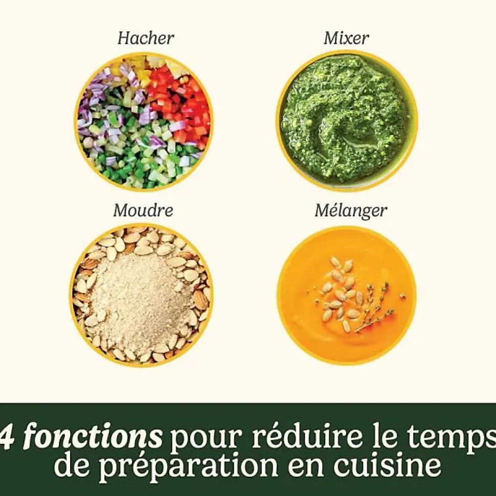 - Hache, broie, mixe et mélange (multifonction).
