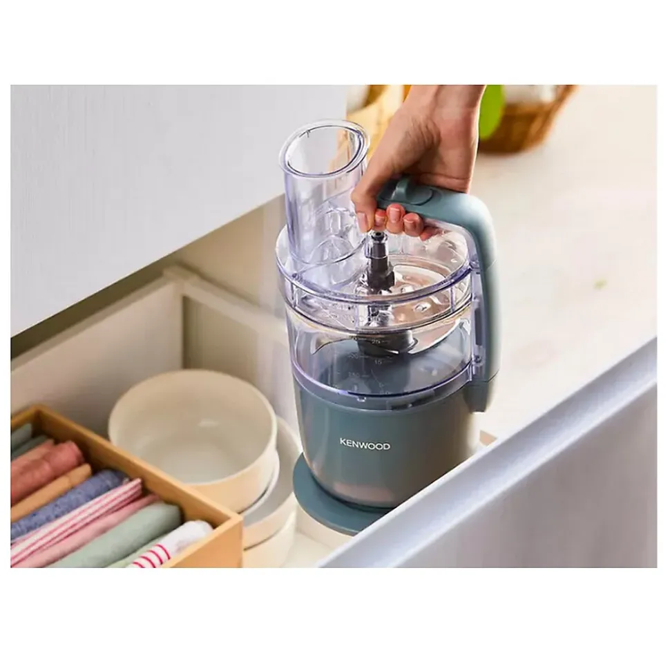 Mini hachoir multifonction 1.3l 650w Kenwood – Mini robot MultiPro Go Kenwood FDP22.140GY. Il est facile à ranger grâce à sa taille mini et aux accessoires qui se rangent simplement dans le bol. Facile à transporter grâce à sa poignée sur le couvercle, le cordon peut même s’enrouler autour de la base. Un gain de place sur votre plan de travail et une cuisine toujours rangée et propre. Mini robot, pouvoirs illimités. La taille d’un mini-hachoir avec la polyvalence d’un robot multifonction. Râper, émincer, mélanger, réduire en purée, hacher, émulsionner, pétrir, mixer : il sait tout faire grâce à ses couteaux et à ses 2 disques en acier inoxydable fournis. Son secret pour s’adapter aux petites comme aux grandes tablées : le système Express ServeTM pour râper et émincer les légumes dans le bol ou en illimité directement dans un saladier. Pilotez votre robot d’un seul doigt pour gérer la vitesse et la touche Pulse. La préparation des repas devient un jeu d’enfant. Le sélecteur de vitesse est toujours visible et facile à manipuler. Un robot pour toute la famille, sans risque de mauvaise manipulation. – Type de produit : Mini robot.Gamme : MultiPro Go.Type : Robot multifonction.Connecté : Non.Puissance (W) : 650.Capacité du bol (L) : 1.3.Nbre de vitesse(s) : 1 + Pulse.Divers : Robot hyper compact avec système Express Serve (râpe et émince en illimité directement dans un saladier).Finition / Nuance : Gris bleu.Système de pesage intégré : Non.Hâchoir : Oui.Râpe : Oui.Autre(s) fonction(s) : Emincer, Mélanger, Réduire en purée, Emulsionner, Mixer.Type de lame / couteau : Couteau inox.Rangement du cordon : Enroulement autour de la base.Nettoyage : Accessoires lavables au lave-vaisselle.Autre(s) équipement(s) : Poignée sur le couvercle.Blender inclus : Non.Accessoire(s) inclus : Express Serve, Bol 1.3 L, Disque inox réversible pour émincer et râper gros (4 mm), Disque inox réversible