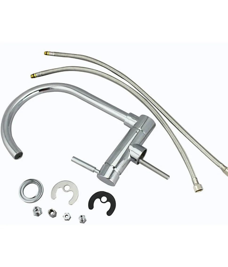 Mitigeur 3 voies rabattable Ravenna – Chrome Le mitigeur 3 voies Ravenna permet de disposer d’eau chaude, froide et filtrée sur un seul robinet, sans avoir besoin de percer un trou supplémentaire pour un robinet secondaire. Idéal pour les cuisines modernes, il s’adapte à tous les systèmes de filtration d’eau, y compris filtration standard ou osmose inverse . Points forts Trois voies intégrées : eau du réseau + eau filtrée Robinet rabattable pour faciliter l’ouverture d’une fenêtre Orientable à 360° pour plus de flexibilité Compatible avec tous les systèmes de filtration domestique Installation simple : fourni avec tous les raccords nécessaires Peut également être utilisé comme mitigeur simple si la voie filtrée n’est pas connectée Dimensions Hauteur totale : 375 mm Hauteur base mousseur : 250 mm Largeur du corps : 177 mm Diamètre de la base : 54 mm Diamètre du trou de perçage du plan de travail : 35 mm Raccordement inclus Pour l’eau du réseau : 2 flexibles avec raccord 3/8″ + adaptateurs 3/8″ → 1/2″ Pour l’eau filtrée : raccord 1/4″ ou 6 mm + adaptateur pour flexible 3/8″ Entretien et précautions Pression réseau maximale : 3 bars Nettoyer uniquement avec un chiffon doux et de l’eau savonneuse Les mitigeurs sont sensibles à l’entartrage ; installer un traitement antitartre dans les régions à eau calcaire pour éviter fuites ou dysfonctionnements