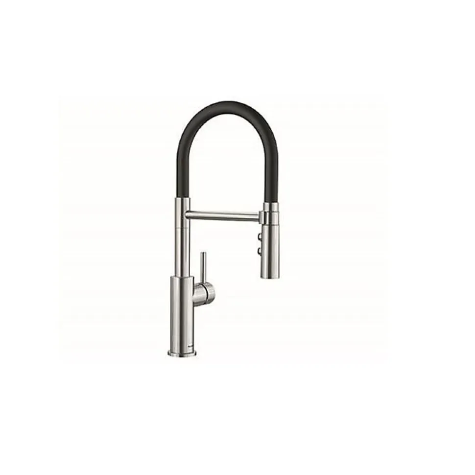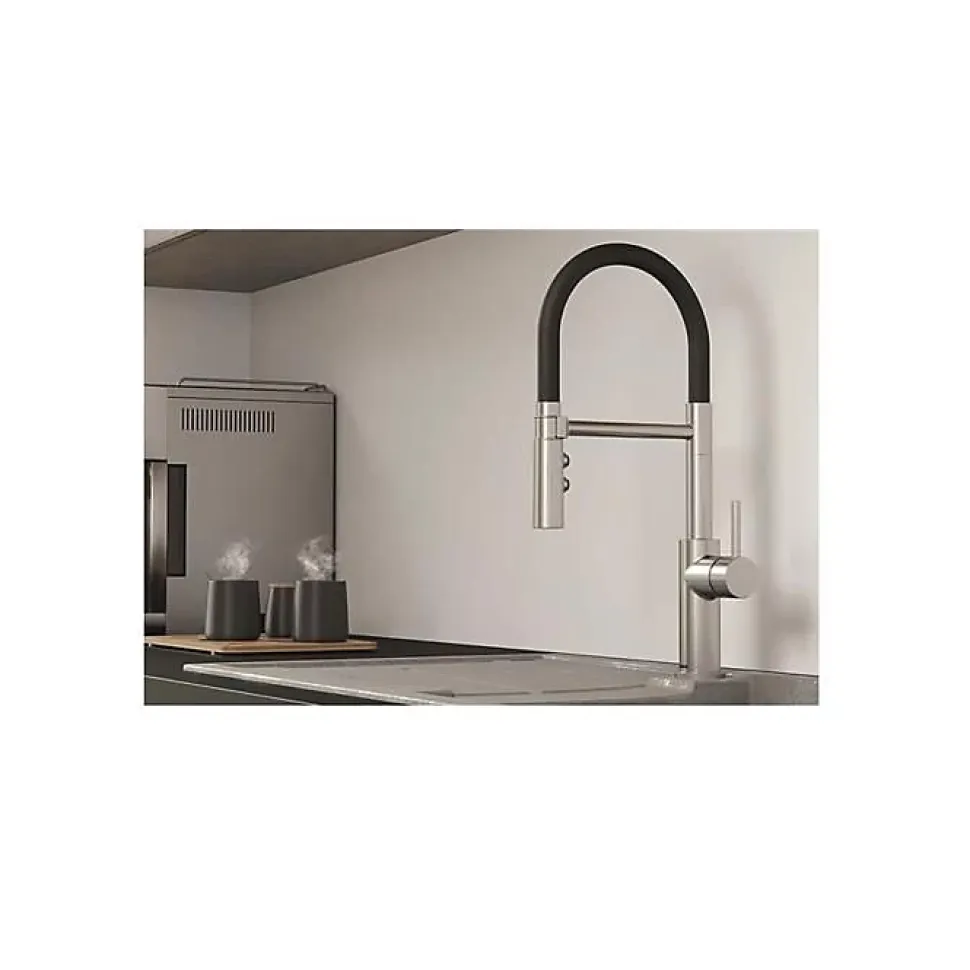 Mitigeur Catris-S Flexo PVD Steel. Des lignes classiques combinées à un design semi-professionnel et des caractéristiques sophistiquées. Flexible noir en polymères offrant une liberté de mouvement optimale. Douchette double jet : simple ou jet pluie. Rangement aisé de la douchette dans le support. Rayon d’action étendu grâce à son bec orientable à 360°.
