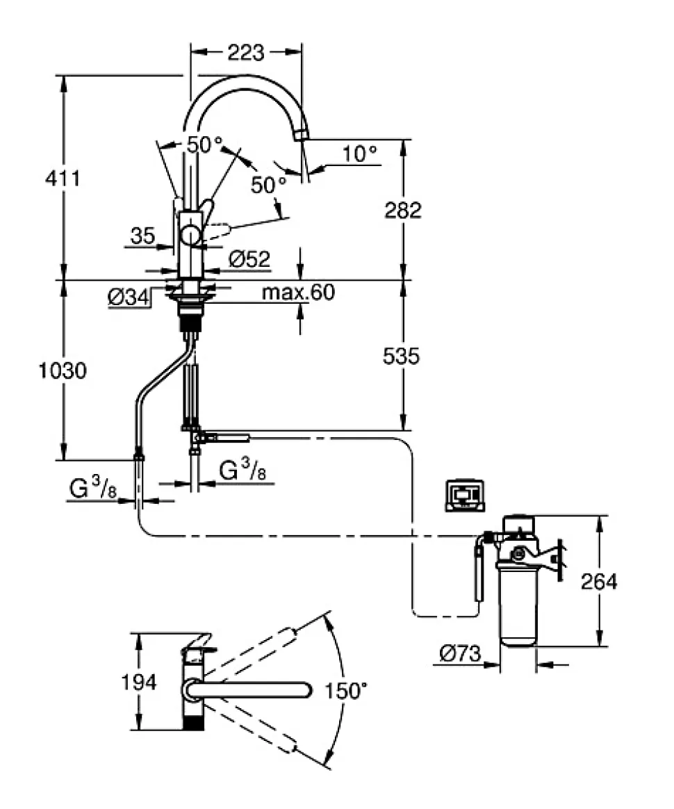- Zone de rotation de 150° – bec orientable pratique pour une manipulation facile