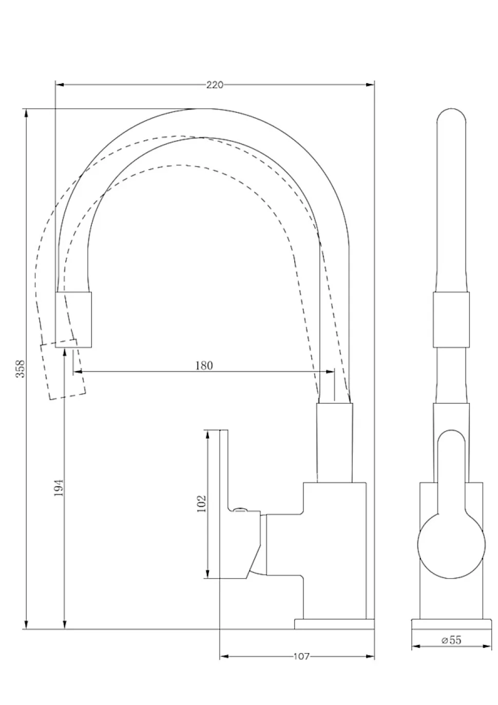 Mitigeur évier hauteur 358 mm Corps diamètre 46mm avec base 55 mm Bec mobile sur flexible noir à mémoire de forme Cartouche à disques céramique 35 mm Alimentation lyres tressées inox 35 cm Kit de fixation facile