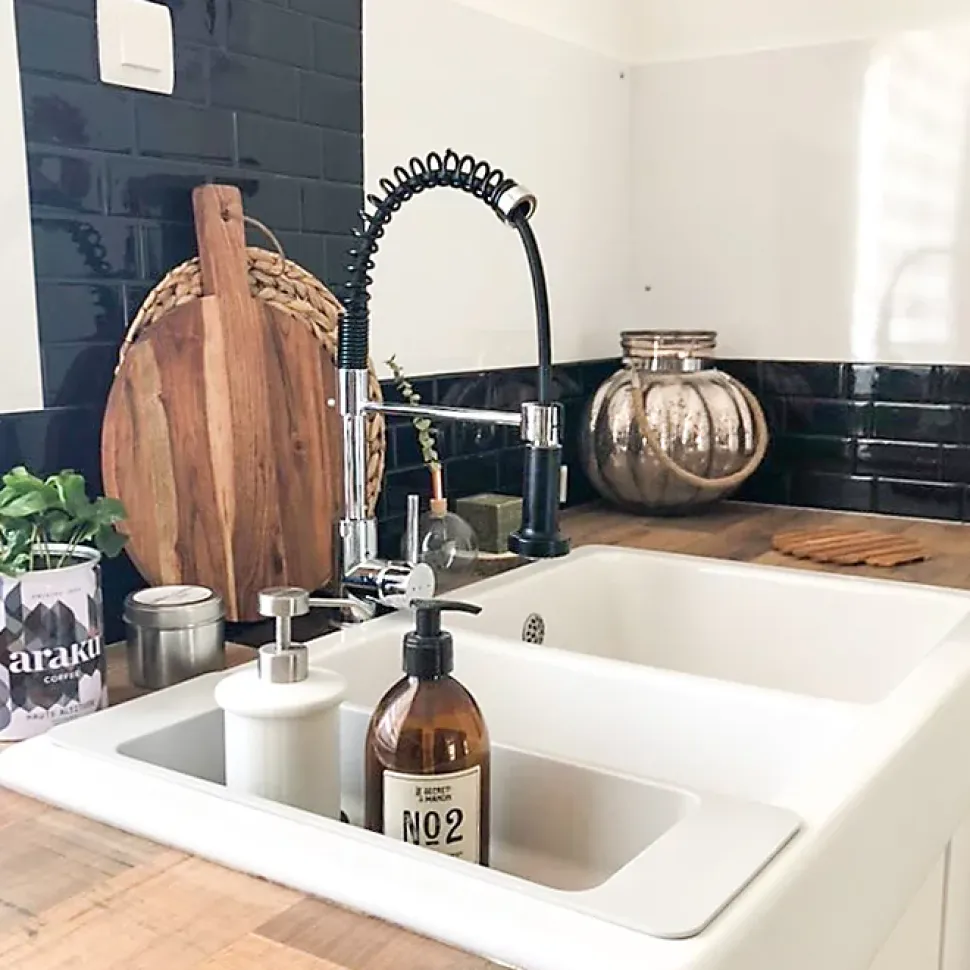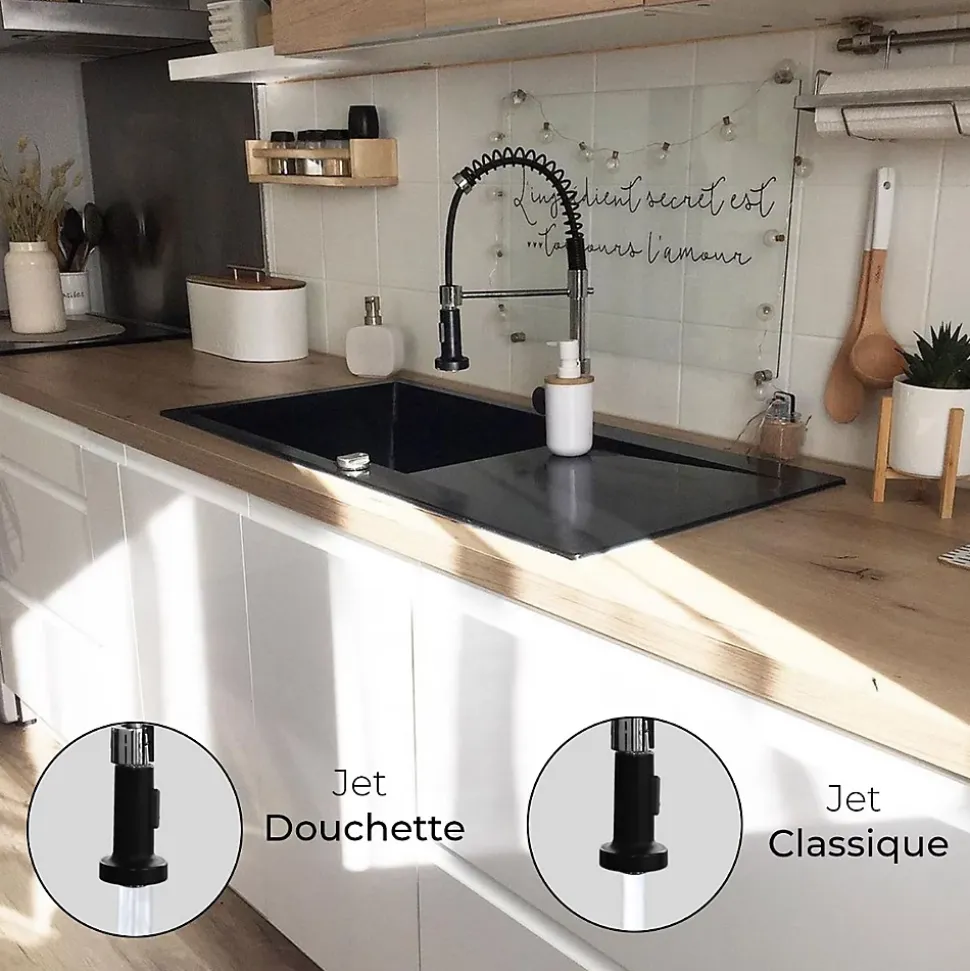 Un robinet mitigeur design et maniable avec sa douchette équipée de 2 jets, voici le ‘Plimo’ plus moderne en version noir ! Pratique et efficace, il est de plus facile à monter avec son système de fixation facile. DESIGN ET QUALITE Couleur : Chromé finition noir Produit : Robinet mitigeur évier à douchette mobile (non extractible) Corps du robinet : Rond en laiton avec barre stabilisatrice de maintien Bec : Pivotant Barre stabilisatrice de maintien : En laiton Poignée : En métal Douchette : Noire et mobile, elle est équipée de bouton 2 jets Mécanisme : Cartouche à disques céramique 35 mm Flexible : Ressort en métal avec flexible tressé noir Kit de fixation : Système ESSEFIX (fixation facile sans outil) Alimentation à l’eau : Lyres tressées inox 35 cm inclus DIMENSIONS Hauteur totale : 442mm Hauteur sous bec : 98mm Largeur sortie d’eau/axe du corps : 201mm Diamètre embase : 50mm NORMES : Certification ACS : Accréditation de Conformité Sanitaire. GARANTIE : Corps garanti 5 ans. Pièces d’usure (poignée, cartouche, flexibles…) garanties 2 ans. Conseils d’utilisations et d’installation : – Avant de procéder au montage, nous vous conseillons de purger soigneusement les tuyauteries d’eau chaude et d’eau froide pour éviter que les saletés et résidus puissent compromettre le bon fonctionnement de la robinetterie. – Après avoir fermé l’alimentation d’eau principale, démonter l’ancienne robinetterie. – Nettoyez soigneusement le filetage des tubes d’alimentation d’eau principale. – Installer le mitigeur de cuisine dans un trou de 35 mm dans un évier ou plan de travail. – Vérifiez que la longueur du bec est compatible avec votre évier (voir dessin technique) Conseils d’entretien : – Pour garder votre robinet le plus longtemps possible, l’idéal est de le nettoyer tous les jours avec un chiffon humide non abrasif ou une microfibre, terminer en essuyant avec une microfibre ou un chiffon sec. – Ne jamais utiliser de solvants, d’éponges métalliques, d’eau de javel, d’acides, de dét