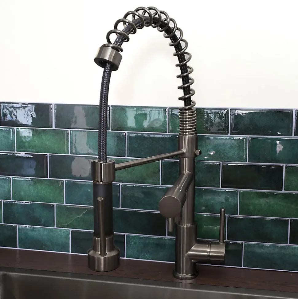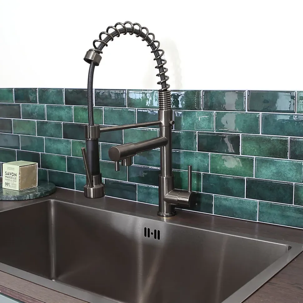 Le ‘Big Pro’ est le mitigeur par excellence. Design moderne et industriel, pratique et complet en version gris gun métal, doté d’un bec verseur, il sera très utile dans votre cuisine. DESIGN ET QUALITE – Couleur : Gris gun métal – Produit : Robinet mitigeur évier à douchette mobile (non extractible) – Corps du robinet : Rond en laiton avec barre stabilisatrice de maintien – Bec : Pivotant et bec verseur avec robinet d’arrêt – Barre stabilisatrice de maintien : En laiton – Poignée : En métal – Douchette : Mobile avec monojet – Aérateur anticalcaire : Oui (limite la production de calcaire) – Mécanisme : Cartouche à disques céramique 35 mm – Flexible : Ressort en métal avec flexible tressé – Kit de fixation : Système ESSEFIX (fixation facile sans outil) – Alimentation à l’eau : Lyres tressées inox 35 cm incluses DIMENSIONS – Hauteur totale : 483mm – Hauteur sous bec : 95mm – Largeur sortie d’eau/axe du corps : 222mm – Diamètre embase : 50mm NORMES : – Certification ACS : Accréditation de Conformité Sanitaire. GARANTIE : – Corps garanti 5 ans. – Pièces d’usure (poignée, cartouche, flexibles…) garanties 2 ans. Conseils d’utilisations et d’installation : – Avant de procéder au montage, nous vous conseillons de purger soigneusement les tuyauteries d’eau chaude et d’eau froide pour éviter que les saletés et résidus puissent compromettre le bon fonctionnement de la robinetterie. – Après avoir fermé l’alimentation d’eau principale, démonter l’ancienne robinetterie. – Nettoyez soigneusement le filetage des tubes d’alimentation d’eau principale. – Installer le mitigeur de cuisine dans un trou de 35 mm dans un évier ou plan de travail. – Vérifiez que la longueur du bec est compatible avec votre évier (voir dessin technique) Conseils d’entretien : – Pour garder votre robinet le plus longtemps possible, l’idéal est de le nettoyer tous les jours avec un chiffon humide non abrasif ou une microfibre, terminer en essuyant avec une microfibre ou un chiffon sec. – Ne jamais utiliser