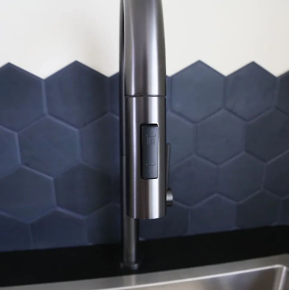 Succombez à la tendance monocouleur de notre robinet de cuisine Portofino. Design unique, tendance et pratique avec sa douchette extractible 2 jets.DESIGN:- Mitigeur évier cuisine- Bec mobile avec douchette extractible 2 jets- Finition gris gun metal – Corps rond.QUALITE:- Corps rond en laiton – Poignée en métal finition cuivre – Cartouche à disques céramiques de 25mm – Flexible ressort en métal avec flexible noir tressé et kit installation facile – Kit de fixation ESSEFIX (fixation facile sans outils) – Alimentation à l’eau avec lyres tressés inox 35cm incluses NORMES:- Certification ACS : Accréditation de Conformité Sanitaire. GARANTIE:- Corps garanti 5 ans – Pièces d’usure (poignée, cartouche, flexibles…) garanties 1 an.Dimensions- Hauteur totale : 43,3 cm – Hauteur sous bec : 23,7 cm – Largeur entre la sortie d’eau et l’axe du corps du robinet : 22,4 cm – Diamètre embase : 47,5 mmVérifiez que la longueur du bec est compatible avec votre évier (voir dessin technique)Conseils d’utilisation et d’installation :- Avant de procéder au montage, nous vous conseillons de purger soigneusement les tuyauteries d’eau chaude et d’eau froide pour éviter que les saletés et résidus puissent compromettre le bon fonctionnement de la robinetterie- Après avoir fermé l’alimentation d’eau principale, démonter l’ancienne robinetterie- Nettoyer soigneusement le filetage des tubes d’alimentation d’eau principale- Installer le mitigeur de cuisine dans un trou de 35 mm dans un évier ou plan de travailConseils d’entretien :- Pour garder votre robinet le plus longtemps possible, l’idéal est de le nettoyer tous les jours avec un chiffon humide non abrasif ou une microfibre, terminer en essuyant avec une microfibre ou un chiffon sec- Ne jamais utiliser de solvants, d’éponges métalliques, d’eau de javel, d’acides, de détergents puissants, de produits nettoyants chimiques agressifs ou de solutions de nettoyage à base de solvants sur le produit.