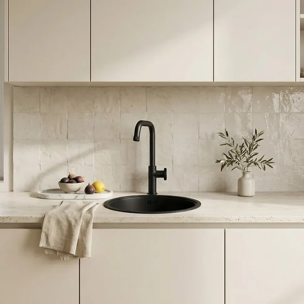 Le style industriel dans votre cuisine avec le mitigeur Indus noir mat, pour un style loft new-yorkais ! Facile à installer avec son système Essefix, il est résistant au calcaire ! DESIGN ET QUALITE – Couleur : Noir mat – Produit : Robinet mitigeur évier – Corps du robinet : Rond en laiton – Bec : Pivotant – Poignée : En métal – Aérateur résistant au calcaire : Oui – Mécanisme : Cartouche céramique de 25 mm – Kit de fixation : Système ESSEFIX (fixation facile sans outil) – Alimentation à l’eau : Lyres tressées inox 35 cm incluses DIMENSIONS – Hauteur totale : 374mm – Hauteur sous bec : 283mm – Largeur sortie d’eau/axe du corps : 197mm – Diamètre embase : 48mm NORMES : – Certification ACS : Accréditation de Conformité Sanitaire. GARANTIE : – Corps garanti 5 ans. – Pièces d’usure (poignée, cartouche, flexibles…) garanties 2 ans. Conseils d’utilisation et d’installation : – Avant de procéder au montage, nous vous conseillons de purger soigneusement les tuyauteries d’eau chaude et d’eau froide pour éviter que les saletés et résidus puissent compromettre le bon fonctionnement de la robinetterie. – Après avoir fermé l’alimentation d’eau principale, démonter l’ancienne robinetterie. – Nettoyez soigneusement le filetage des tubes d’alimentation d’eau principale. – Installer le mitigeur de cuisine dans un trou de 35 mm dans un évier ou plan de travail. – Vérifiez que la longueur du bec est compatible avec votre évier (voir dessin technique) Conseils d’entretien : – Pour garder votre robinet le plus longtemps possible, l’idéal est de le nettoyer tous les jours avec un chiffon humide non abrasif ou une microfibre, terminer en essuyant avec une microfibre ou un chiffon sec. – Ne jamais utiliser de solvants, d’éponges métalliques, d’eau de javel, d’acides, de détergents puissants, de produits nettoyants chimiques agressifs ou de solutions de nettoyage à base de solvants sur le produit.