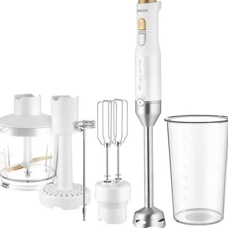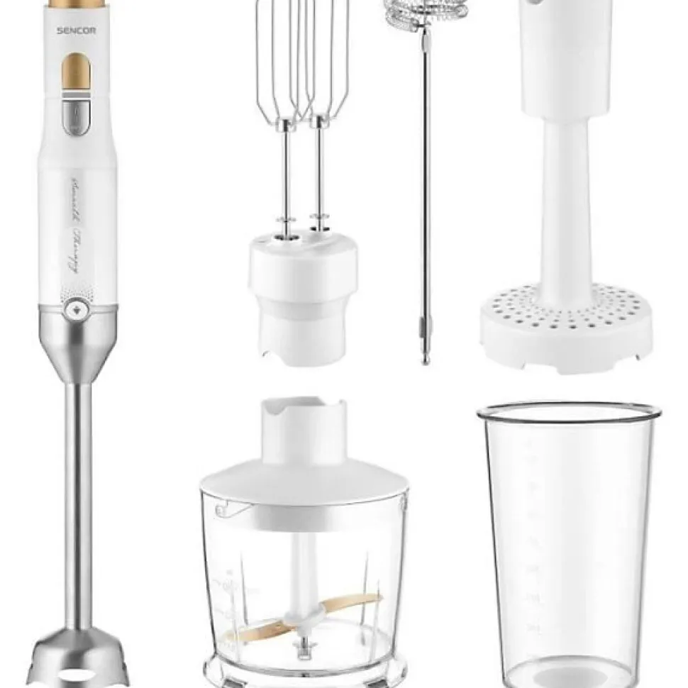 Mixeur plongeant Sencor SHB 6441WH 1200 W blanc — technologie Titanium QuadBlade, pied inox 20 cm, contrôle de vitesse continu, ergonomique. Kit 4 en 1 avec gobelet 800 ml, hachoir 500 ml, batteur double et mousseur à lait. Garantie moteur 10 ans.