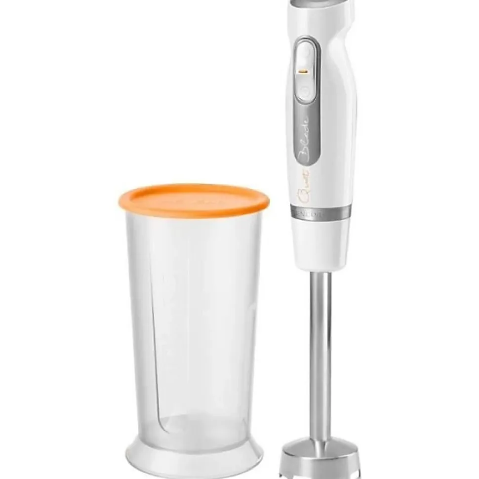 Mixeur plongeant SENCOR SHB 4358WH — 800 W, 2 vitesses (standard + Turbo), pied amovible en inox, 4 lames inox capables de broyer la glace, gobelet doseur 700 ml, moteur extra silencieux, poignée ergonomique et commandes à boutons. Idéal pour soupes, sauces et smoothies.