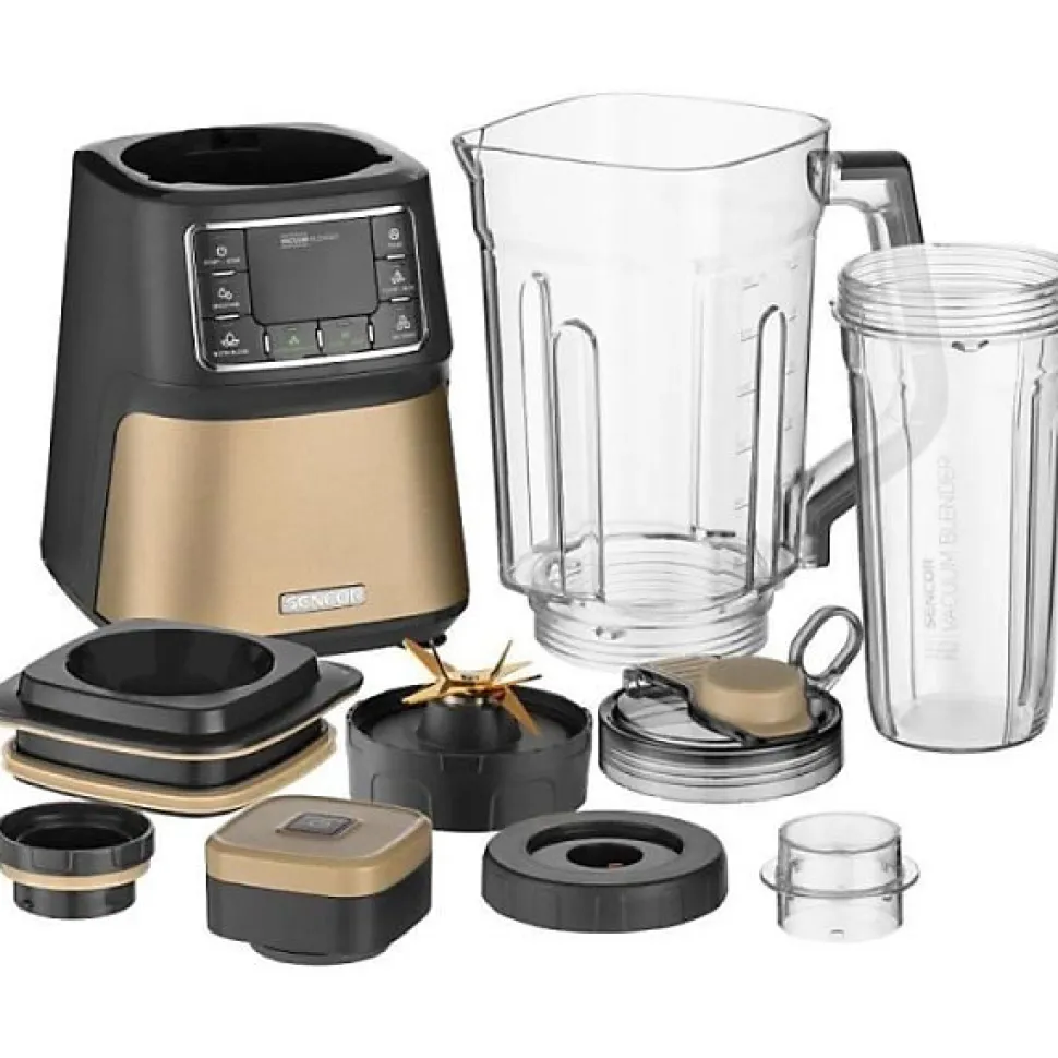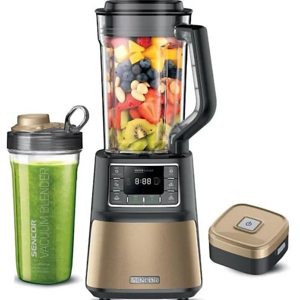 Blender Sencor SBU 7677CH 1500 W avec technologie Nutri Smart Blending, 7 programmes, 7 vitesses, 8 lames inox pour textures optimales. Bol et corps en plastique résistant, finition champagne, accessoires inclus : récipient de stockage 0,7 L et unité de vide. Pièces compatibles lave-vaisselle, sécurisé pour usage domestique.