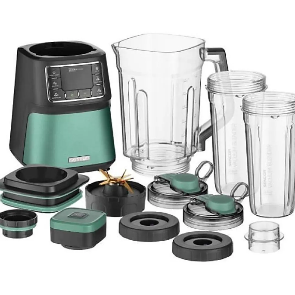 Blender sous vide Sencor SBU 7871GR 1500 W, 28 000 tr/min, bol Tritan 1,5 L et bouteille 0,7 L inclus. Technologie Nutri de mélange sous vide pour limiter l’oxydation et préserver nutriments. 8 lames revêtues titane, 7 programmes prédéfinis plus PULSE et ICE, pièces amovibles compatibles lave-vaisselle et sécurité avec verrouillage et pieds antidérapants.