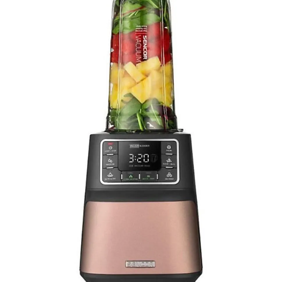 Super Blender sous vide SENCOR SBU 7875RS: pichet Tritan 1,5 L + bouteille 0,7 L, moteur 1 500 W jusqu’à 28 000 tr/min, 8 lames acier avec revêtement titane, fonction sous vide, 7 programmes préconfigurés, 3 vitesses et fonction Pulse; pièces amovibles lavables au lave-vaisselle et accessoires de rangement inclus.