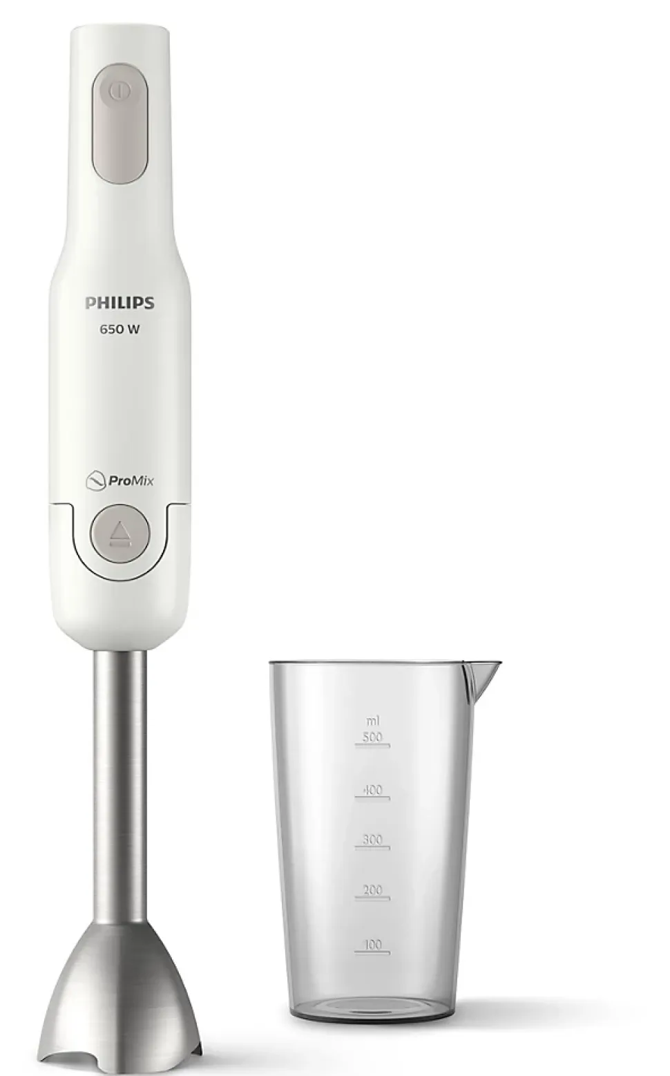 Mixeur plongeant Daily Collection – ProMix – Un mixage rapide et efficace grâce à son puissant moteur – Fixez et détachez facilement le pied métal à la simple pression sur un bouton – Son pied métal en forme de vague évite les éclaboussures pendant le fonctionnement – Bol doseur gradué 500 ml – Coloris Blanc – Puissance 650 W – garantie 2 ans.