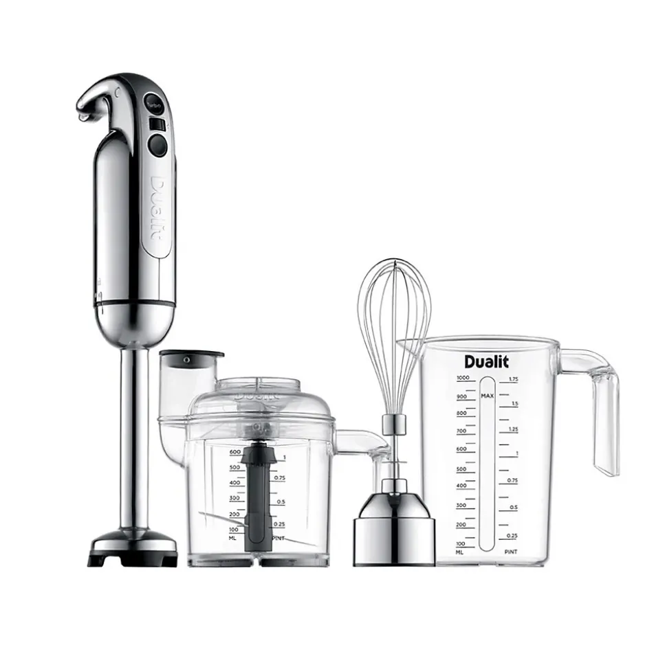 Mixeur plongeant multifonctions 700w inox Dualit – Vous voulez un assistant de cuisine tous azimuts qui fait des travaux légers de tâches culinaires tous les jours? Le mixeur plongeant multitâche de Dualit vous permettra de hacher, réduire en purée et fouetter en toute facilité et de façon homogène. – Puissance : 700 WVitesse variablePlage de vitesse : 7000-16000 rpmOption Turbo : 17 000 à 18000 rpmPied spécial anti-rayuresCruche Tritan de 1 L à bec verseur anti-goutteBol hachoir 0.6L avec pieds anti-dérapantsPoignée ergonomiqueAccessoires : pied mixeur en inox, fouet ballon, bol hachoir, bol de préparation en PVCSans BPADimensions (LxPxH) : 6.4 x 12.6 x 37.8 cmCouleur : Inox