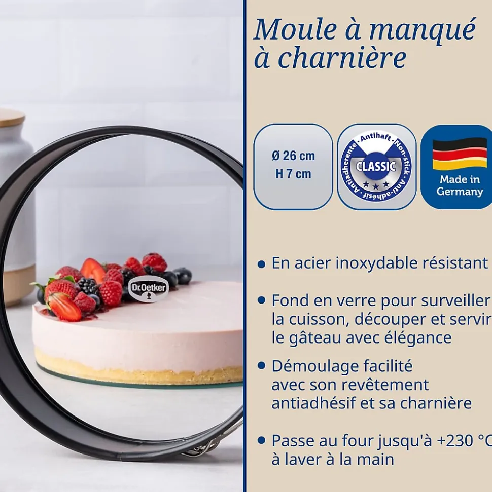 - DESCRIPTION : Le moule à manqué Dr Oetker avec fond de verre vous offre l’excellence de la cuisson pour tous vos gâteaux ronds. Solide et résistant, il sera vite un indispensable pour vos recettes pâtissières.