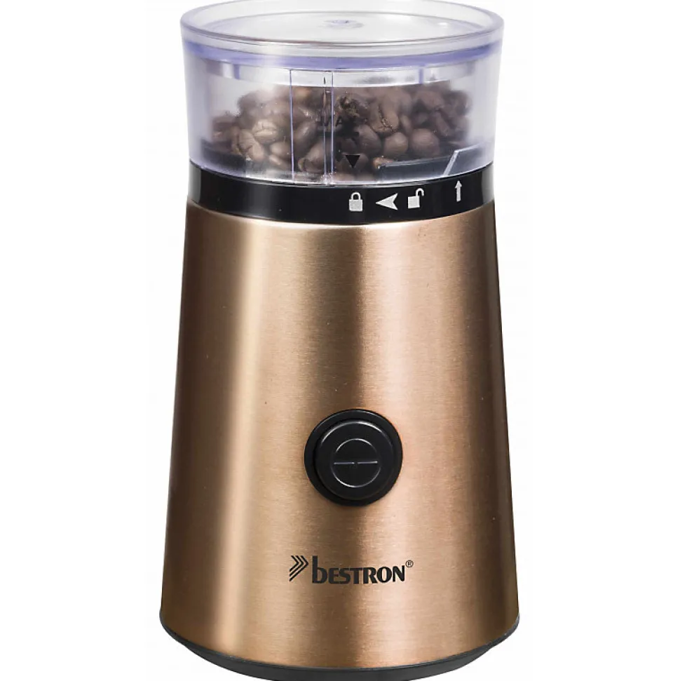 Le moulin à café BESTRON ACG1000CO est un moulin électrique performant de 150 W, avec une capacité de broyage de 50 g. Il est doté d’un couvercle amovible, d’un réservoir transparent, d’un couteau en inox et de pieds antidérapants. Son design cuivre compact et sa technologie avancée permettent une mouture précise et régulière, pour un café d’excellence.