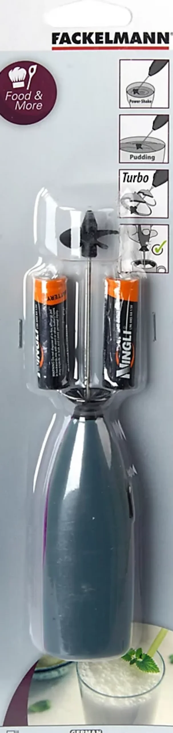 DESCRIPTION : Ce mini mélangeur est idéal pour mélanger rapidement toute sorte de poudre dans un liquide de manière efficace, rapide et obtenir une mousse épaisse et onctueuseLE PETIT + : Les 2 piles sont fourniesCOMPOSITION et ENTRETIEN : Plastique, Acier inoxydable | Lavage au chiffon secDIMENSIONS : 19 x 2,5 x 4 cmCONTENU : 1 mini mixeur turbo avec 2 piles fourniesLe mini mixeur turbo proposé par Fackelmann est fourni avec 2 piles, il est très pratique pour faire de la mousse de lait à ajouter dans votre café pour former un délicieux cappuccino. Vous pouvez également émulsionner votre boisson sportive et ou diététique pour un résultat parfait.Fackelmann France est une entreprise spécialisée dans la distribution d’ustensiles de cuisine et de pâtisserie ainsi que de moules à gâteaux et de plaques de cuisson. L’entreprise tente d’apporter une certaine facilité dans la façon de cuisiner de chacun grâce à ses ustensiles malins.Les ustensiles de cuisine de Fackelmann France sont proposés à tous les profils de cuisiniers pour une utilisation simple et quotidienne. Les fouets, spatules, louches, éplucheurs, planches à découper et bien d’autres sont à votre portée afin de préparer de délicieuses recettes toujours plus originales.